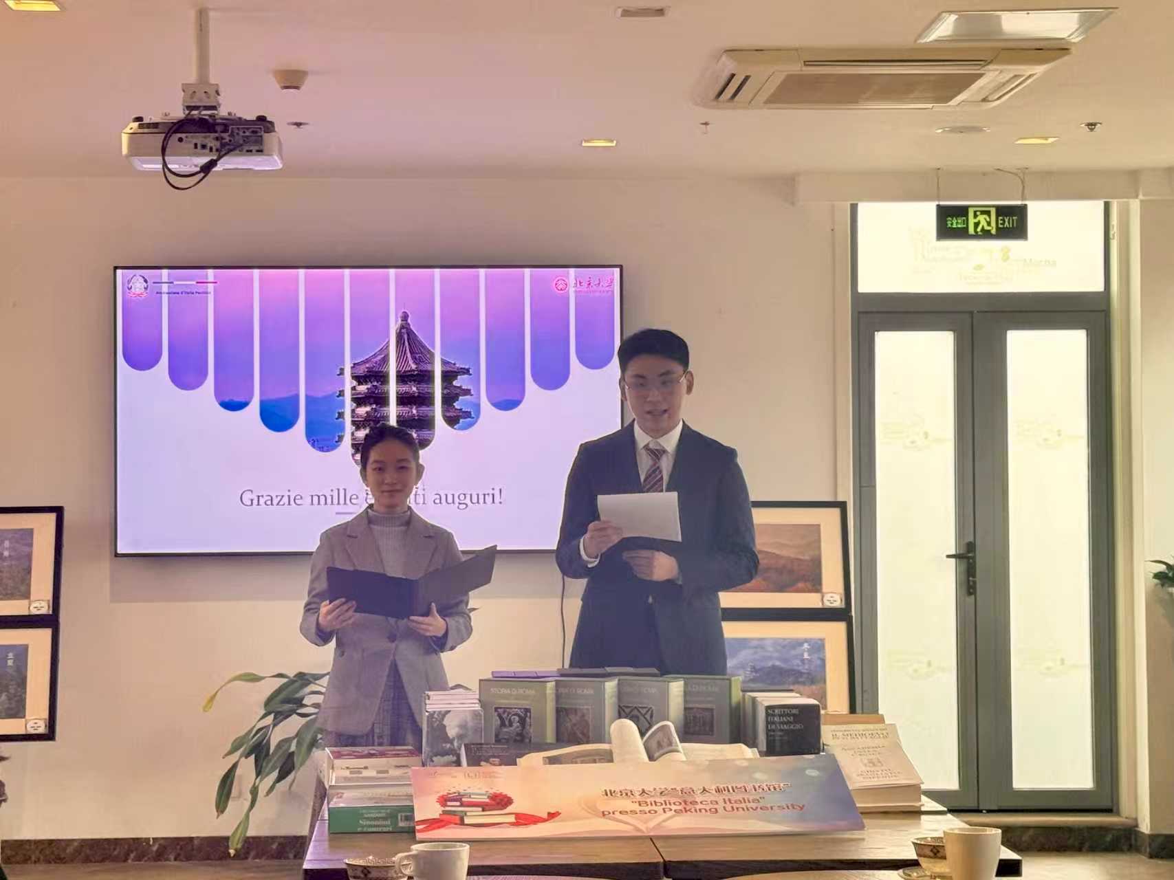 The event was attended by Elisa Palana, First Secretary of the Embassy of Italy in China, Addetto Culturale Daniele Galleni, prof. Fan Xing, Director of the Department of European Languages and Literatures at Peking University, Zhang Xiaoyan, director of SFL library, and all faculty and students of the Italian language program.