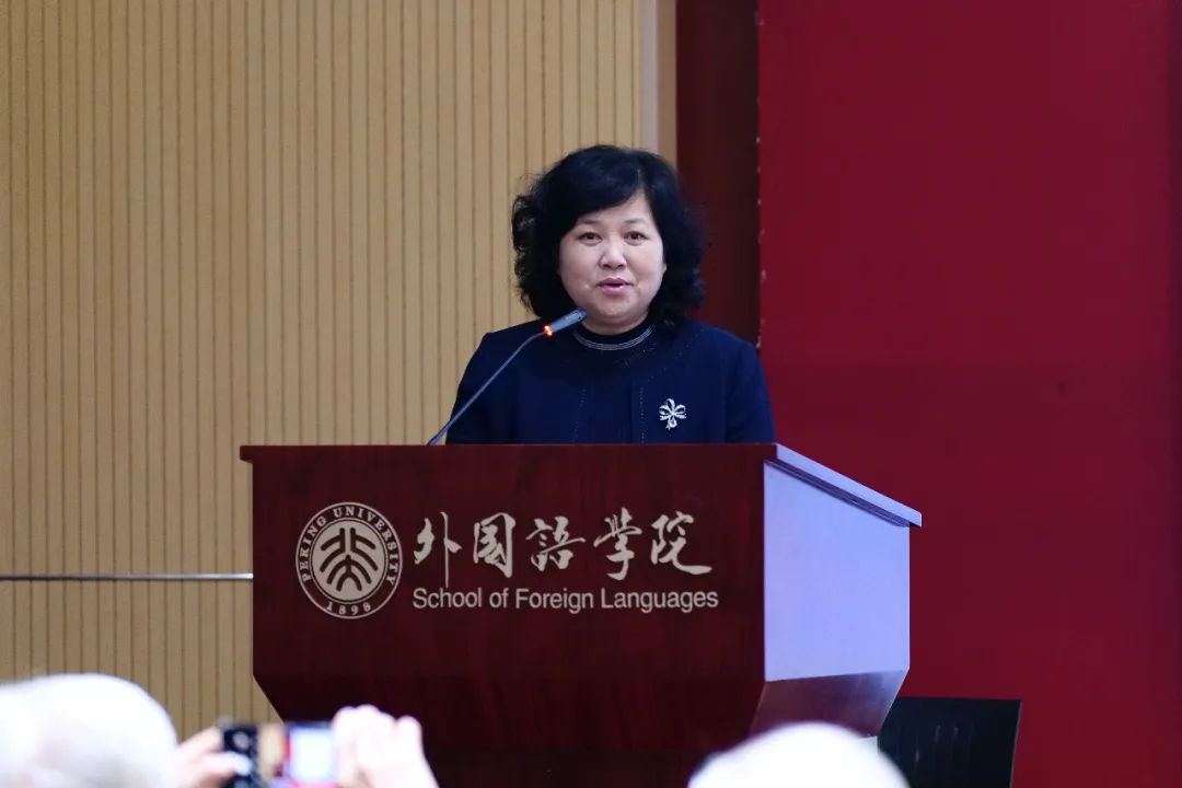 Li Shujing, Secretary of the Party Committee of Peking University’s School of Foreign Languages, delivering her speech.