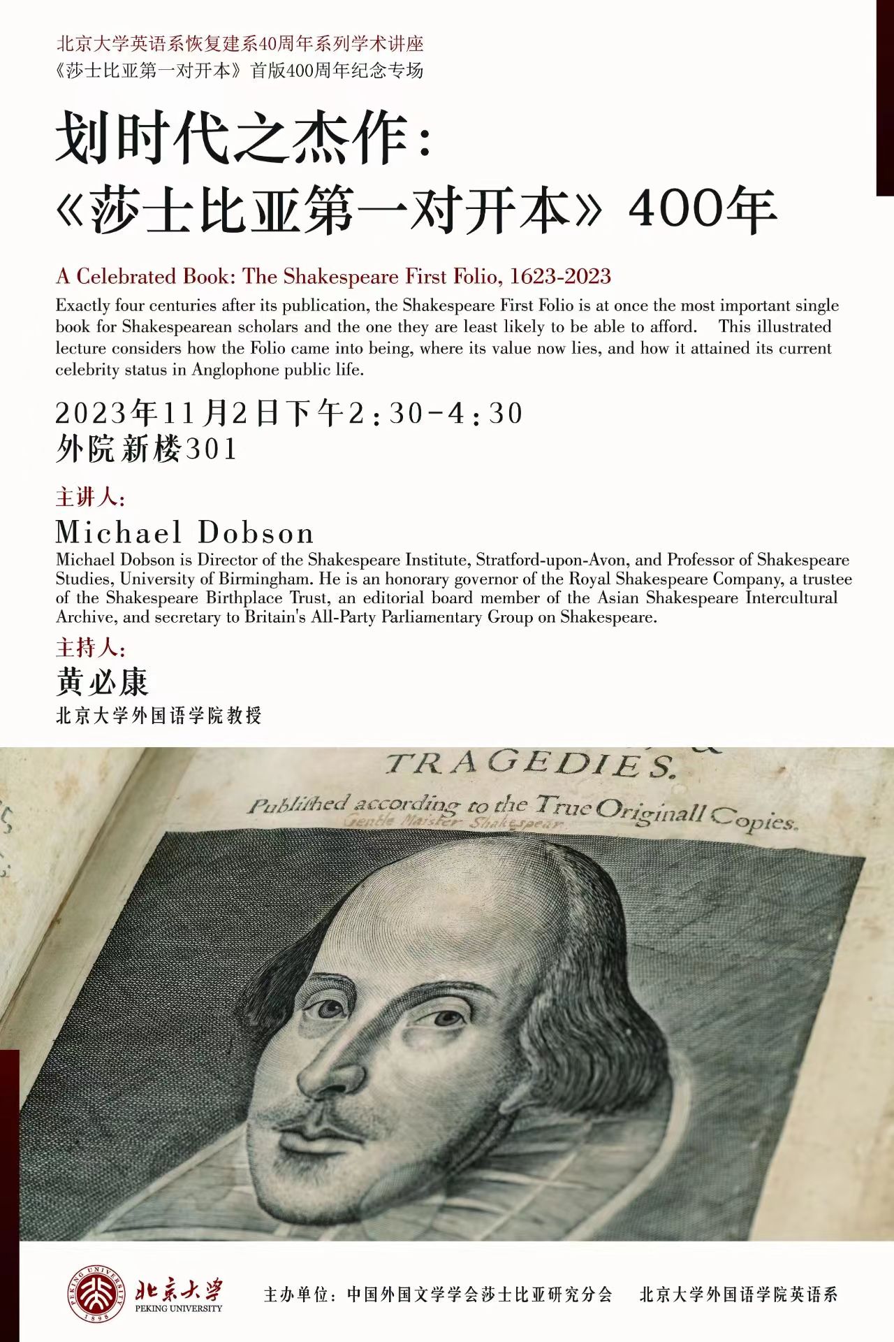 3003新葡平台登录入口英语系恢复建系40周年系列学术讲座:划时代之杰作:《莎士比亚第一对开本》400年 讲座预告