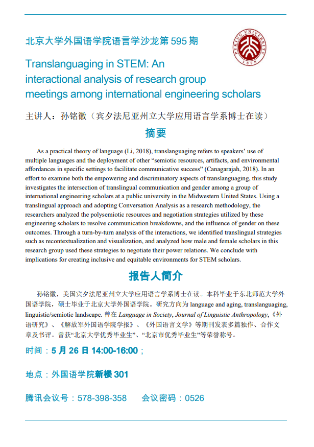 服务导航 3003新葡平台登录入口语言学沙龙第595期:Translanguaging in STEM:An interactional analysis if research group meetings among international engineering scholars 2023-05-21