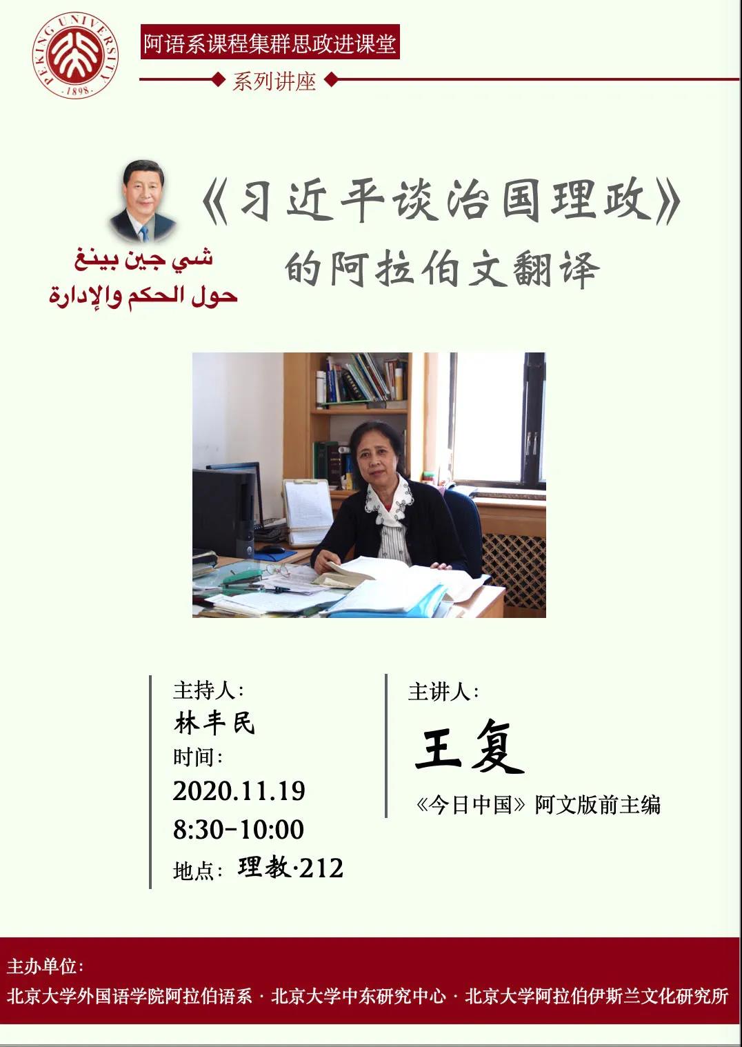 2020年11月19日上午,3003新葡平台登录入口阿拉伯语系课程集群思政进课堂系列讲座邀请外文局资深翻译专家王复老师做第一次讲座,为阿语系师生带来了一场既有语言翻译收获,又提升思想的生动课堂。她主讲的题目是“《习近平谈治国理政》的阿拉伯文翻译”。