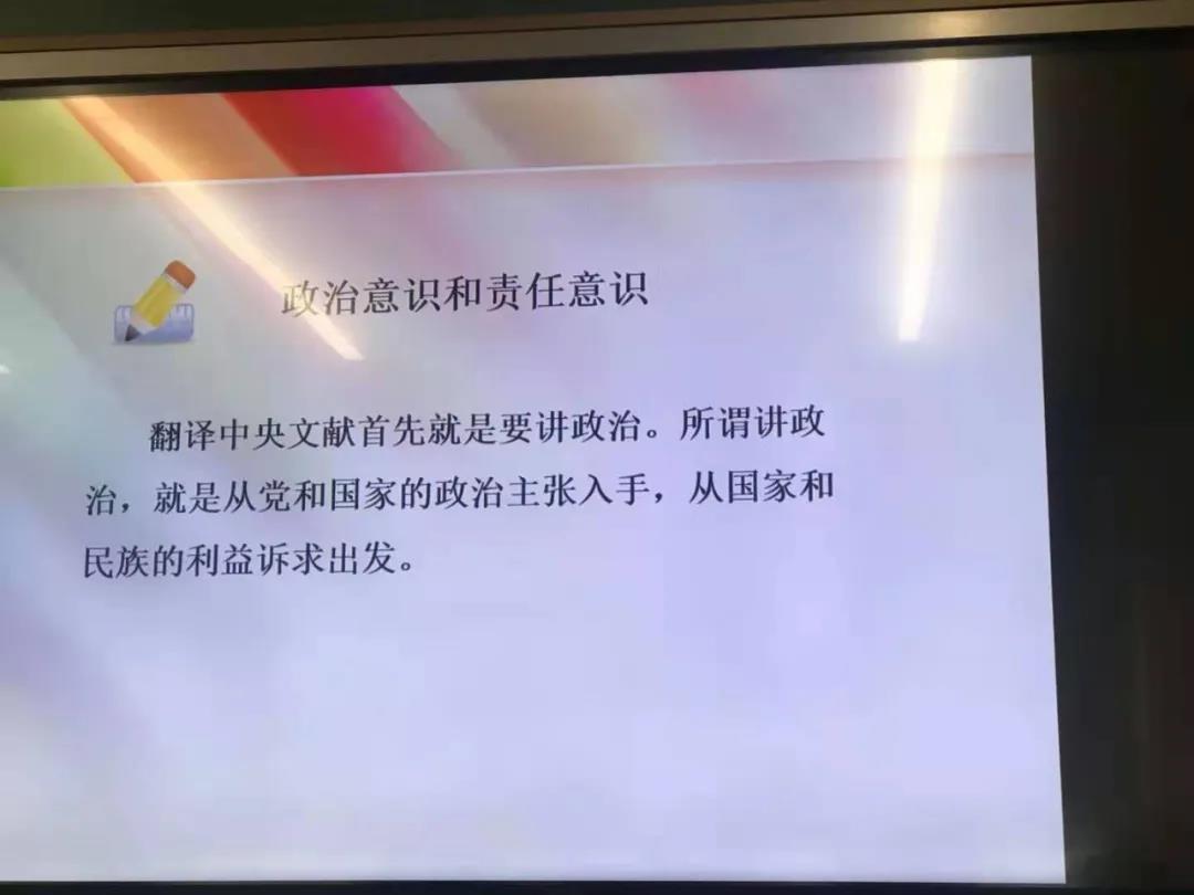 霍娜强调了翻译在当今政治生活中对于树立中国形象、表达中国话语、阐明中国理念的重要意义。随后她以中央文献的翻译为例,向同学们讲述了如何从各个层面切实地提高自己的翻译水平和翻译素养。首先是要明确政治意识和责任意识。翻译中央文献首先就是要讲政治,要从党和国家的政治主张入手,从国家和民族的利益诉求出发。在翻译过程中要紧绷这根弦,要具有足够的政治素养,关注时事,了解政治,学习理解相关政策,储备足够的政治知识,绝不能犯政治错误。霍娜特别提醒同学们要注意政治考量,在自己的积累尚且不足的时候,遇到拿捏不准的问题,要学会到特定的地方找到有关的知识,了解相关情况。