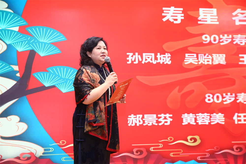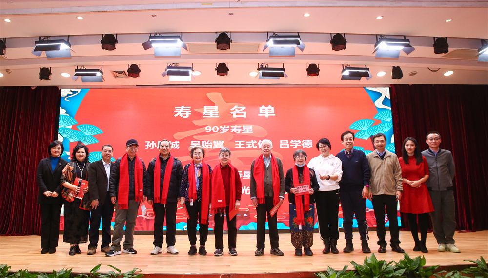 2023年,外院共有4位90岁寿星和6位80岁寿星,作为团拜会的传统保留节目,党委书记李淑静带领学院领导班子成员共同为老寿星们祝寿。外院各项成绩的取得,离不开广大离退休教师的积极参与大力支持。李淑静以“德厚心宽人高寿,老当益壮天阳和”为贺词,恭祝寿星教师80、90华诞。在温馨的《生日快乐》旋律中,学院领导班子成员搀扶老寿星们缓缓走上舞台,并为他们戴上红围巾致以崇高的敬意和衷心祝福。