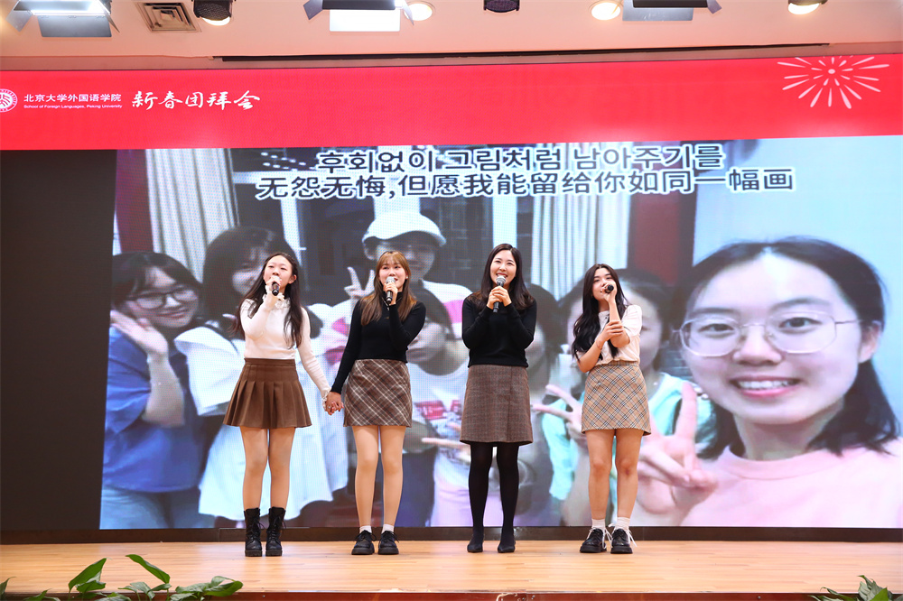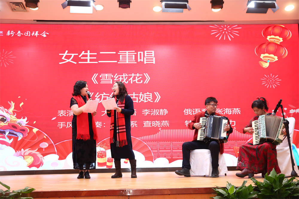 团拜会还安排了丰富多彩的文艺表演和互动环节。日语系同学杨谦锐带来快板《玲珑塔》,伶俐的口齿、顿挫的调子、脆快的板声引得掌声连连。英语系研公英副教授程英演唱歌曲《春风十万里》,用美声带领观众饱览祖国大好河山。日语系博士后王天驰、向伟带来能乐选段《清经》,展现了日本传统戏剧之美。朝韩语系外教朴智娟和她的学生共同演唱韩语歌曲《我对于你,你对于我》,温暖人心的曲调展现出双向奔赴的师生情,令人动容。伴随着俄语系教授查晓燕和特邀嘉宾邹京力老师悠扬的手风琴声,英语系研公英教授李淑静和俄语系副教授张海燕带来经典英语歌曲《雪绒花》和经典俄语歌曲《纺织姑娘》。欣赏着女声二重唱的动人旋律,观众的心情也变得温暖而幸福。语言所助理教授郑萱带来吉他弹唱《岁岁》,轻柔的吉他声与感情充沛的歌声相融合,让歌中蕴含的情感更具感染力。语言所长聘副教授胡旭辉之子胡晋嘉小朋友为大家带来古筝演奏《琵琶语》,郑萱以莲花鼓伴奏,清丽婉转的金石丝竹之声如清泉缓缓流泻全场,滋润听众心田。南亚学系副教授姜永红深情演唱歌曲《如愿》,表达了一代人的愿景,也传递出感动与力量,激励我们去传承、去拼搏。即将退休的语言所教授高一虹为大家带来舞蹈《手之语:花开花落》。纤巧的手法与身法、步法巧妙结合,优雅、轻柔的中国古典舞身韵让人心旷神怡。画风一转,英语系大学英语退休教授黄必康高亢嘹亮的男高音划破长空,慷慨激昂地演唱《沁园春·雪》,雄浑的嗓音和精湛唱功令人心潮澎湃。