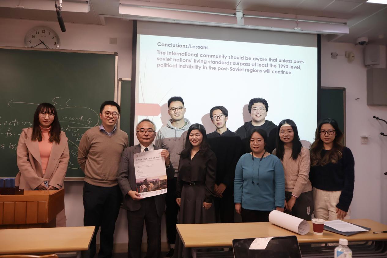 在讲座互动环节,松里公孝教授围绕苏联解体、俄乌冲突等问题与同学们展开热烈讨论,并对师生提出的问题一一做出精彩回应。最后,由主持人施越助理教授对讲座做简短总结,并对松里公孝教授表示衷心感谢。讲座圆满结束。