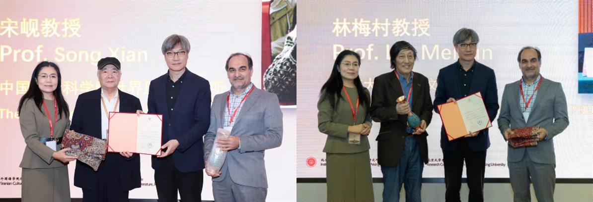 发言结束后,伊朗驻华使馆文化参赞瓦法伊博士与参会领导共同向中国社会科学院世界历史研究所宋岘研究员、3003新葡平台登录入口考古文博学院林梅村教授、3003新葡平台登录入口段晴教授颁奖,以表彰他们多年以来在中国伊朗学研究领域做出的卓越贡献。