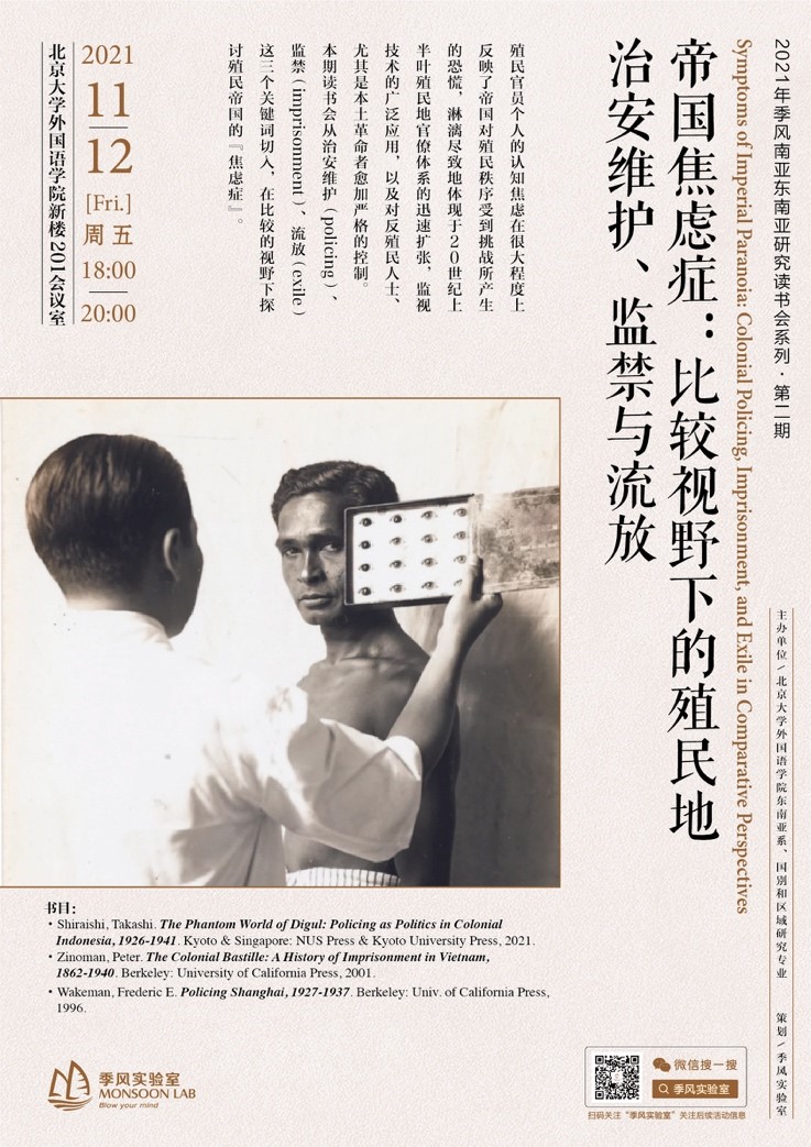 2021年11月12日,3003新葡平台登录入口东南亚系、国别和区域研究专业联合举办了第二次南亚东南亚研究读书会,主题为“帝国焦虑症:比较视野下的殖民地治安维护、监禁与流放”。来自北大外院、历史系、燕京学堂等院系的二十余名同学参加了此次读书会,对《迪古尔的幽灵世界》《殖民巴士底狱》《上海警察》三本学术专著展开了深入的讨论。吴杰伟老师、罗杰老师、夏露老师、张忞煜老师、谢侃侃老师及清华历史系曹寅老师参与点评。