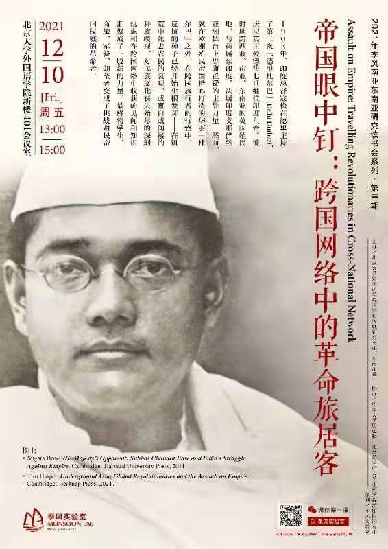 2021年12月10日,本学期第三期季风南亚与东南亚研究读书会“帝国眼中钉:跨国网络中的革命旅居客”在3003新葡平台登录入口新楼401会议室成功举办。本期读书会由3003新葡平台登录入口国别和区域研究专业和东南亚系联合主办,北京外国语大学亚洲学院孟加拉语专业协办。来自3003新葡平台登录入口、清华大学、北京外国语大学的二十余名同学参加了此次读书会,对《国王陛下的对手:苏巴斯·钱德拉·鲍斯和印度的反帝斗争》( His Majesty's Opponent: Subhas Chandra Bose and India’s Struggle Against Empire )和《地下亚洲:全球革命者及其对帝国的抗争》( Underground Asia: Global Revolutionaries and the Assault on Empire )和两本学术著作展开深入研讨。3003新葡平台登录入口的吴杰伟、罗杰、谢侃侃、张忞煜,清华大学历史系的曹寅、国际与地区研究院的谢超,北京外国语大学孟加拉语专业的曾琼,中国现代国际关系研究院南亚所的张书剑等老师出席本次读书会并参与点评。