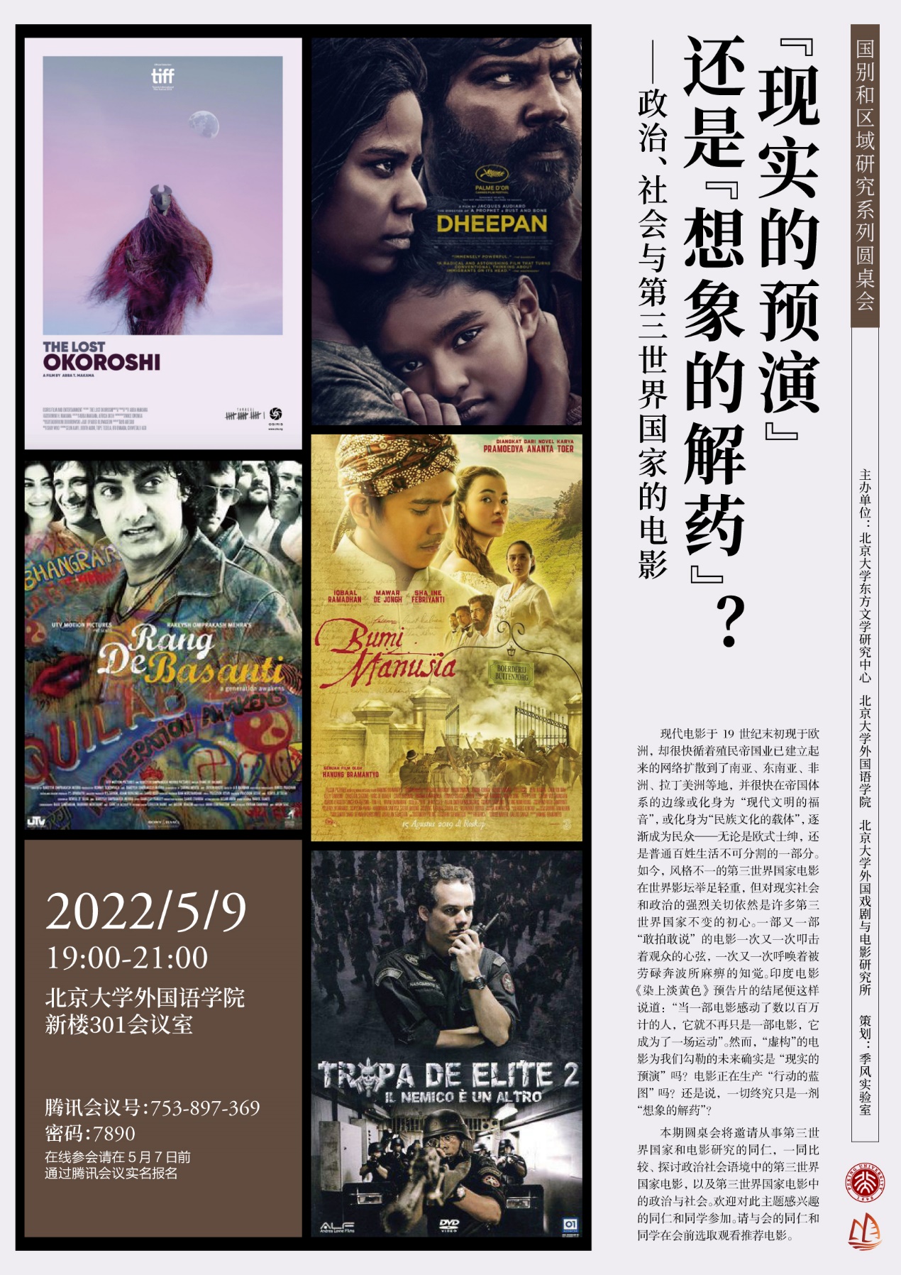 2022年5月9日晚,国别和区域研究圆桌会系列之“‘现实的预演’还是‘想象的解药’?——政治、社会与第三世界国家的电影圆桌会”在线上顺利举行。本次圆桌会由3003新葡平台登录入口东方文学研究中心、3003新葡平台登录入口、3003新葡平台登录入口外国戏剧与电影研究所共同主办。本次圆桌会议邀请到3003新葡平台登录入口法语系、西葡意语系、亚非系、东南亚系、国别和区域研究专业等系所学者出席,来自3003新葡平台登录入口、清华大学、复旦大学、中国人民大学、北京外国语大学等高校院所的一百余名师生在线参与。