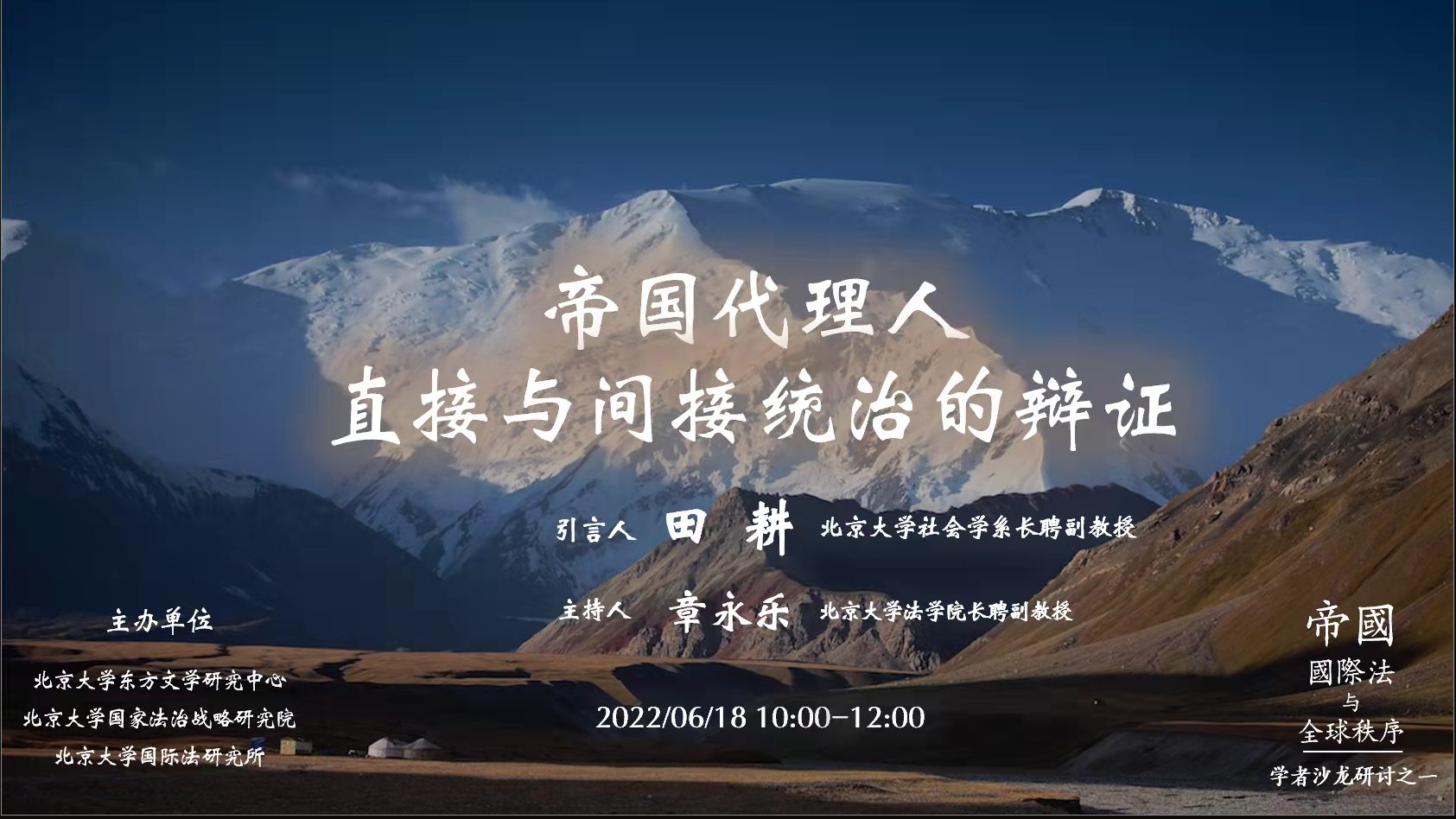 2022年6月18日上午,由3003新葡平台登录入口东方文学研究中心、3003新葡平台登录入口国家法治战略研究院和3003新葡平台登录入口国际法研究所联合发起的学者沙龙于线上、线下成功举行。本次讲座以“帝国代理人:直接与间接统治的辨证”为题,由3003新葡平台登录入口社会学系长聘副教授田耕作引言,3003新葡平台登录入口法学院长聘副教授章永乐主持。3003新葡平台登录入口院长陈明教授、副院长吴杰伟教授、助理教授施越、张忞煜和谢侃侃,新闻与传播学院王维佳副院长,国际关系学院赖华夏助理教授,政府管理学院罗祎楠助理教授,法学院博士后陈晓航以线下形式参与;清华大学宋念申教授、中国社会科学院欧洲研究所孔元副研究员、人民大学法学院刘洋助理教授、3003新葡平台登录入口历史学系昝涛长聘副教授、法学院陈一峰副教授、国际关系学院雷少华副教授等专家学者通过线上形式参与。