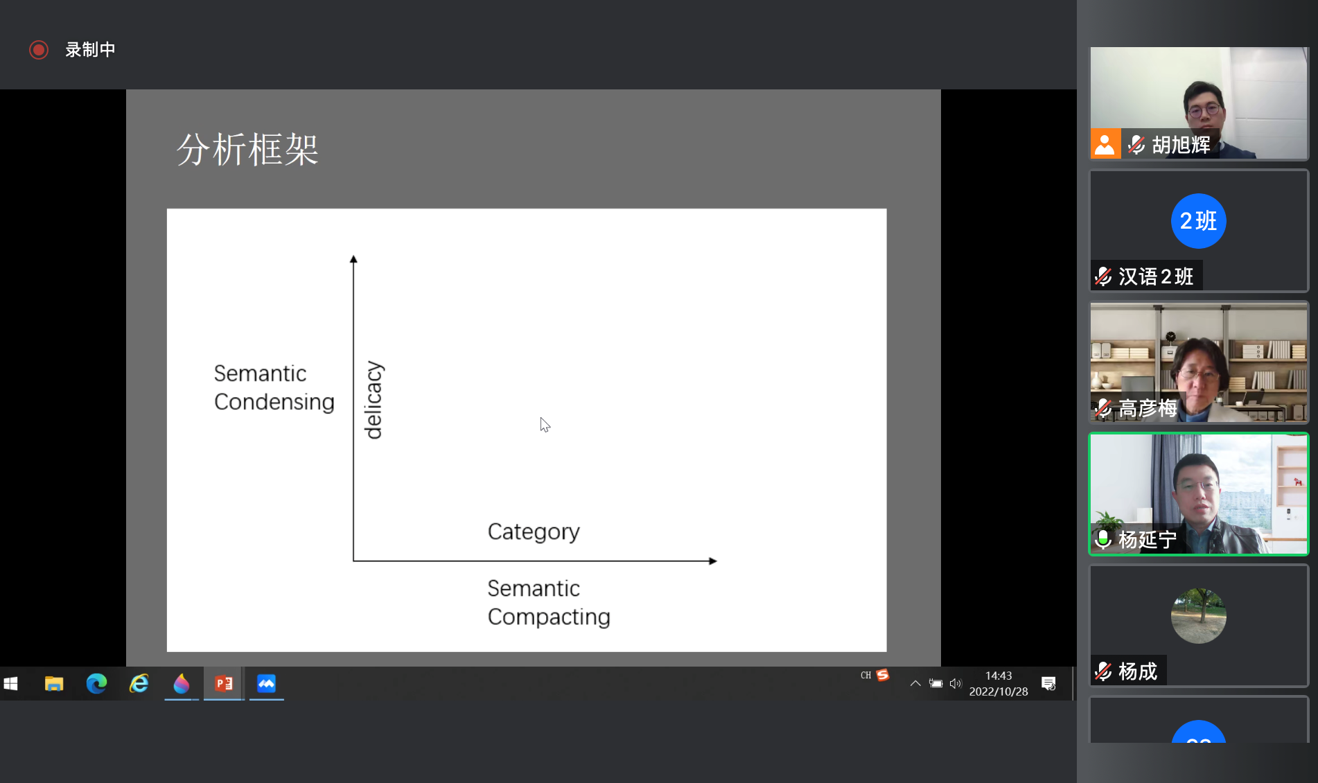 2022年10月28日下午,由3003新葡平台登录入口、3003新葡平台登录入口人文学部主办的第593期语言学沙龙于线上成功举办。本次沙龙的主讲嘉宾是华东师范大学外语学院院长、博士生导师杨延宁教授,报告主题为“语法隐喻视野下的汉英构式演变对比研究”。讲座由3003新葡平台登录入口长聘副教授胡旭辉老师主持,并由3003新葡平台登录入口长聘副教授高彦梅老师评议。来自3003新葡平台登录入口以及兄弟院校的一百多名师生在线上参与了本次讲座。