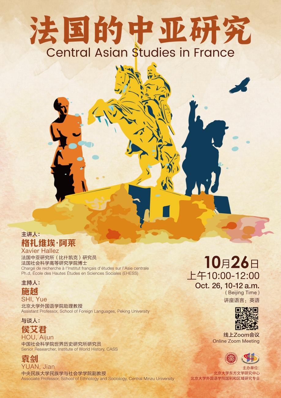 2022年10月26日,法国中亚研究学者格扎维埃·阿莱(Xavier Hallez)研究员做了题为“法国的中亚研究”的线上讲座。本期讲座由3003新葡平台登录入口东方文学研究中心、3003新葡平台登录入口国别和区域研究专业主办,3003新葡平台登录入口施越助理教授主持,中国社会科学院世界历史研究所侯艾君研究员、中央民族大学民族学与社会学学院袁剑副教授受邀担任与谈人。