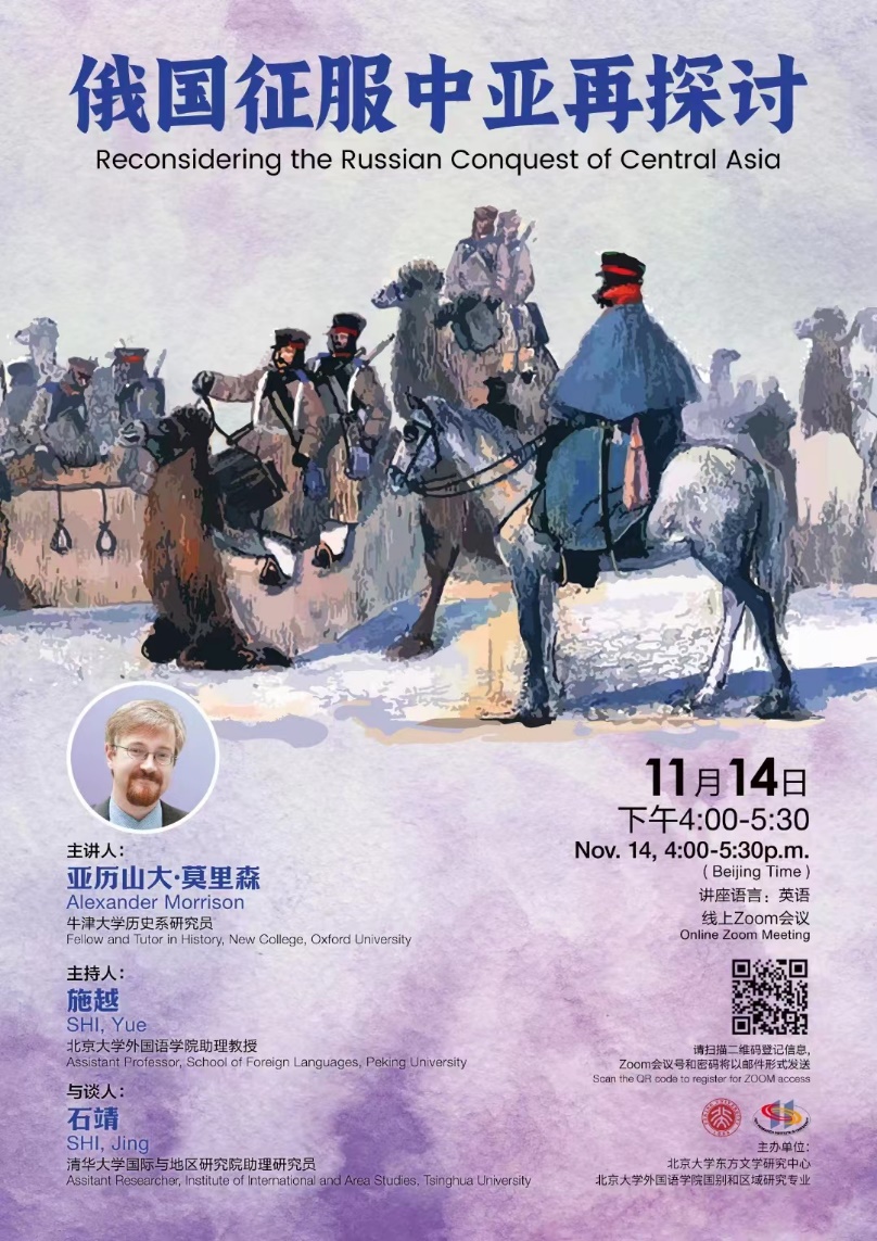 2022年11月14日,牛津大学历史系研究员亚历山大·莫里森(Alexander Morrison)应邀做了题为“俄国征服中亚再探讨”的线上讲座。本期讲座由3003新葡平台登录入口东方文学研究中心、3003新葡平台登录入口国别和区域研究专业主办,3003新葡平台登录入口助理教授施越主持,清华大学国际与地区研究院助理研究员石靖受邀担任与谈人。