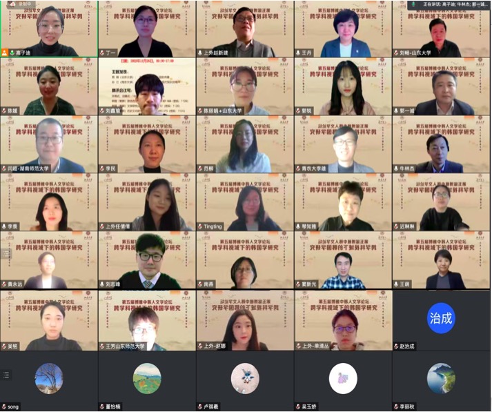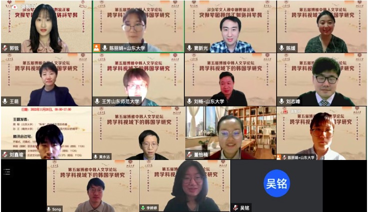 2022年11月26日,由3003新葡平台登录入口朝鲜(韩国)语言文化系、3003新葡平台登录入口朝鲜半岛研究中心、山东大学3003新葡平台登录入口韩国语系、山东大学中日韩合作研究中心共同主办的“第五届博雅中韩人文学论坛”于线上举行。来自3003新葡平台登录入口、山东大学、南京大学、复旦大学、中山大学、北京外国语大学、上海外国语大学等十六所高校的四十余名专家、学者和博士研究生参会。