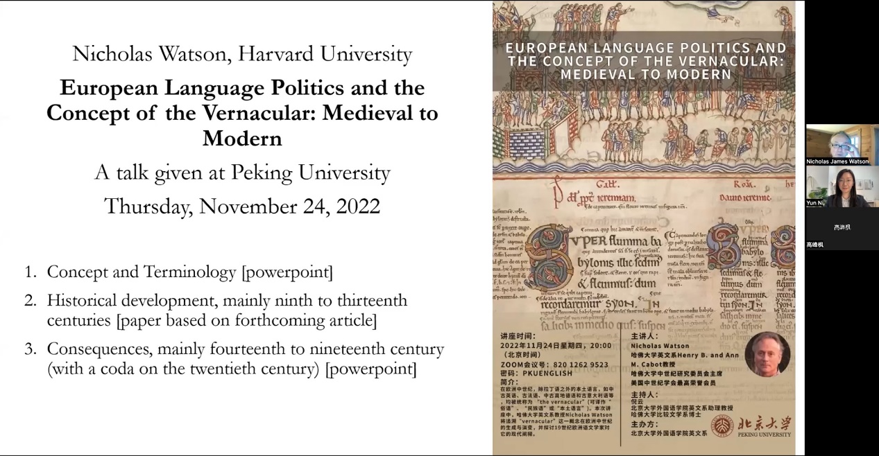 2022年11月24日,哈佛大学英文系教授尼古拉斯·沃特森(Nicholas Watson)应3003新葡平台登录入口英语系邀请,为北大师生在线上进行了题为“欧洲中世纪到现代的语言政治与俗语的概念”(European Language Politics and the Concept of the Vernacular: Medieval to Modern)的专题讲座。本讲座由3003新葡平台登录入口英语系主办,3003新葡平台登录入口英语系助理教授倪云主持、评议。