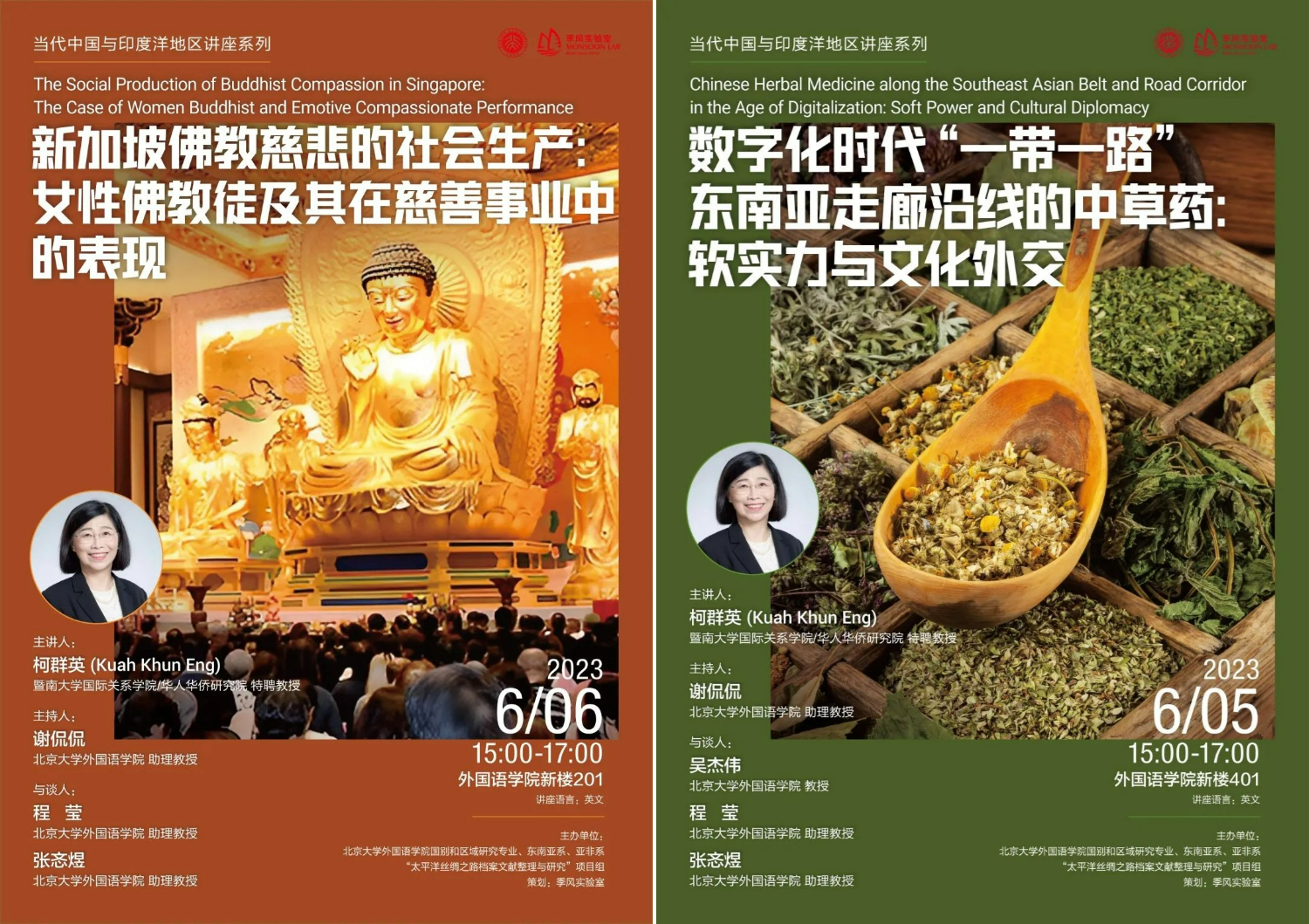 2023年6月5日和6日,文化人类学与华人移民研究领域的资深学者、暨南大学国际关系学院/华人华侨研究院特聘教授柯群英(Kuah Khun Eng)受邀举办题为“数字化时代‘一带一路’东南亚走廊沿线的中草药:软实力与中国外交”和“新加坡佛教慈悲的社会生产:女性佛教徒及其在慈善事业中的表现”的两场学术讲座。此次学术交流活动由学院国别和区域研究专业、东南亚系、亚非系和“‘太平洋丝绸之路’档案文献整理与研究”项目组主办。