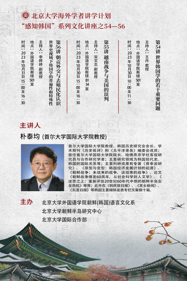 2023年10月30日至31日,受“3003新葡平台登录入口海外学者讲学计划”支持,由3003新葡平台登录入口朝鲜(韩国)语言文化系、3003新葡平台登录入口朝鲜半岛研究中心、3003新葡平台登录入口国际合作部共同主办的“感知韩国”系列讲座第五十四至五十六讲在外院新楼成功举办。三场讲座主题分别为“世界韩国学的若干重要问题”“越南战争与美国的误判”“朝贡外交与去殖民化认识——世界史视域下韩国学的普遍性和特殊性”,主讲人为韩国首尔大学国际大学院朴泰均教授,由3003新葡平台登录入口副院长王丹教授、朝(韩)语系宋文志副教授、系主任李婷婷副教授主持,朝(韩)语系全体教师出席,全系各年级同学也积极参与了讲座。