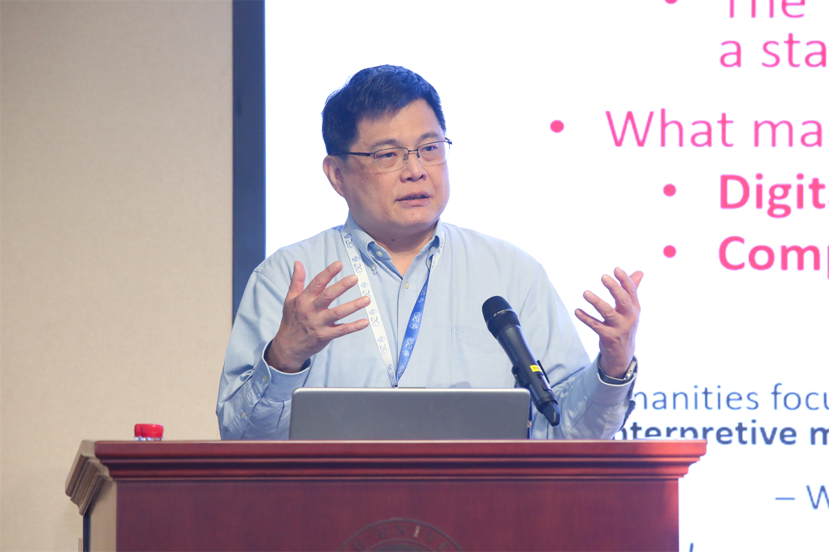 第二场的主题为“作为一种人文学术范式的数字人文”,由上海交通大学教授王宁主讲。王教授从人文学者的视角出发,以数字人文在科学技术与人文之间的桥梁作用切入,对数字人文在比较文学相关研究中的作用进行了讨论,包括数字人文为比较文学研究带来的挑战,数字人文在世界文学研究中的重要意义。王教授指出,一方面,作为一种人文学术范式,数字人文为传统的人文研究,尤其是文学研究带来了许多新的挑战;另一方面,数字人文在科技与文学和文学研究之间的重要性不容忽视。王教授强调,在数字化时代,我们应该积极拥抱人文精神,引入新的人文研究范式。