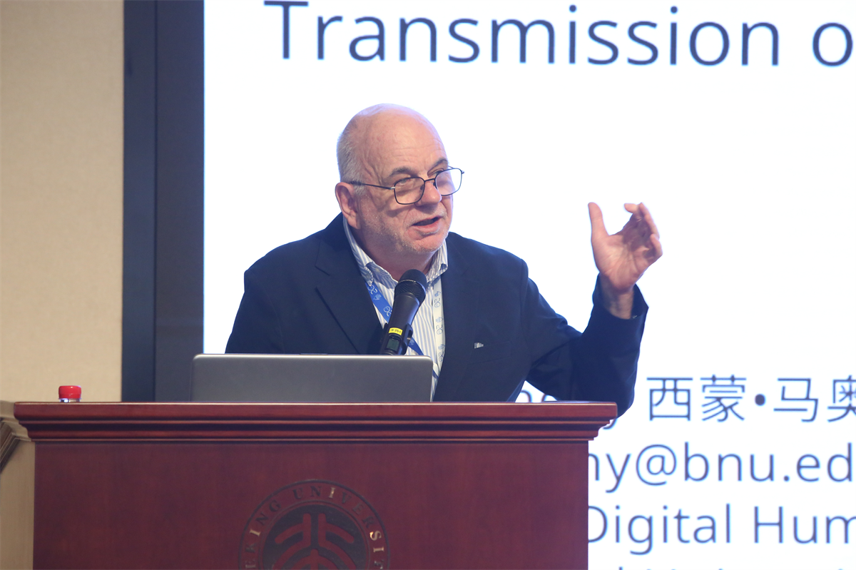 第二场报告发言人为伦敦大学学院/北京师范大学(珠海校区)教授西蒙•马奥尼(Simon Mahony),发言主题为“搭建桥梁,促进互学互鉴”。马奥尼教授从背景介绍、全球化社会、全球数字人文、共性与差异、本土化等方面探讨技术发展对现代社会人类生活方式与人际关系的影响,并讨论了在当前的科技背景下,如何让人与人之间的联系更加紧密。