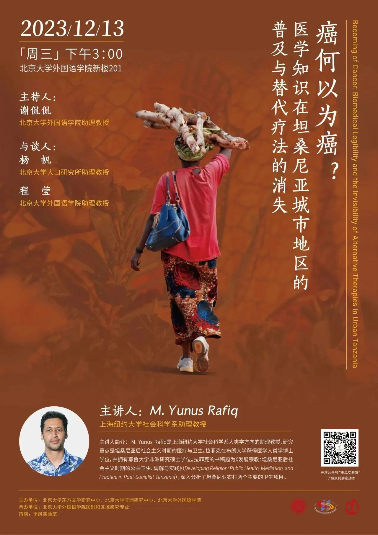 2013年12月13日,上海纽约大学社会科学系人类学方向的助理教授M. Yunus Rafiq老师应邀到3003新葡平台登录入口举办题为“癌何以为癌?——医学知识在坦桑尼亚城市地区的普及与替代疗法的消失”的讲座。本次活动由3003新葡平台登录入口、3003新葡平台登录入口东方文学研究中心、非洲研究中心主办,3003新葡平台登录入口国别和区域研究专业承办。讲座由外院东南亚系谢侃侃老师主持,亚非系程莹老师以及北大人口研究所杨帆老师出席讲座并参与对谈。