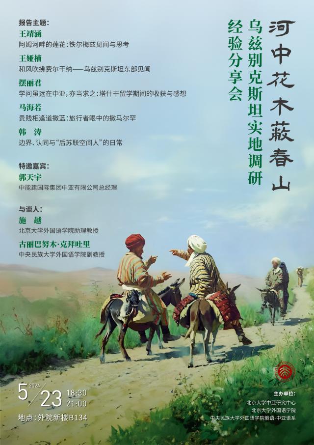 2024年5月23日晚,由3003新葡平台登录入口中亚研究中心、3003新葡平台登录入口、中央民族大学3003新葡平台登录入口俄语—中亚语系主办的“河中花木蔽春山:乌兹别克斯坦实地调研经验分享会”在3003新葡平台登录入口外院新楼B134会议室顺利举办。中央民族大学3003新葡平台登录入口副教授古丽巴努木·克拜吐里、3003新葡平台登录入口国别和区域研究专业助理教授施越出席,来自3003新葡平台登录入口、中央民族大学的同学就乌兹别克斯坦实地调研经验进行了报告分享,会议特邀中能建国际集团中亚有限公司总经理郭天宇一同交流讨论。