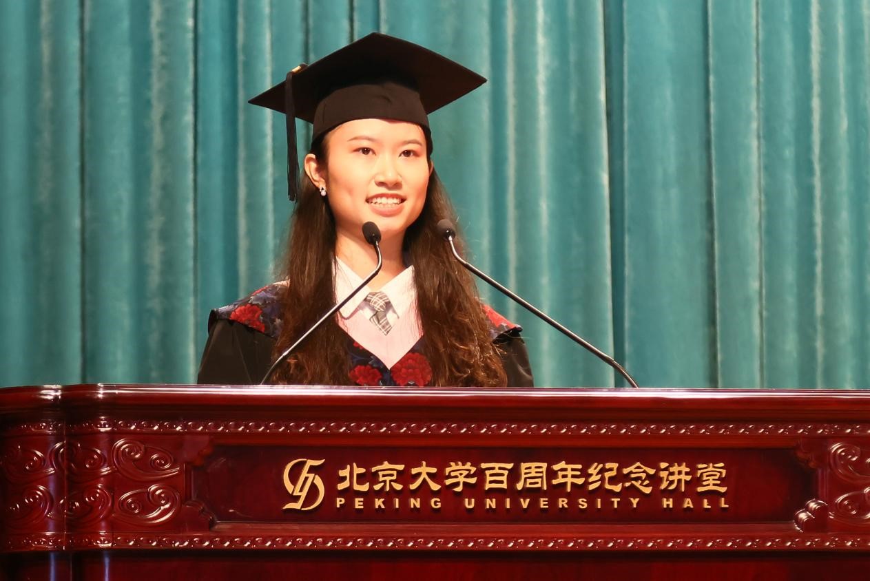 2021级东南亚系硕士生姬美伊作为硕士毕业生代表发言。她向辛勤付出的恩师表达了最诚挚的感谢,回顾有迷茫、有温暖、有情怀的求学道路。她分享了自己在学术研究和翻译实践中的成长历程,不断探索、勇于实践。在求学路上,来自师长、同伴的温暖,让她坚定前行、不畏艰难。她感谢志愿服务和社会实践的经历,以实际行动响应习近平总书记“爱国、励志、求真、力行”的殷切嘱托,展现了北大学子的责任与担当。