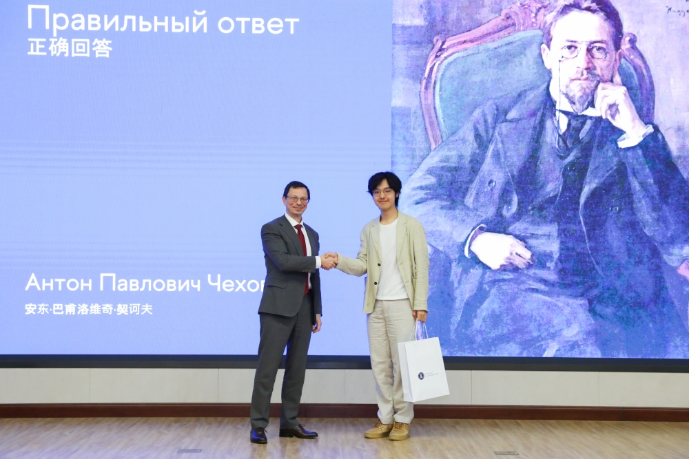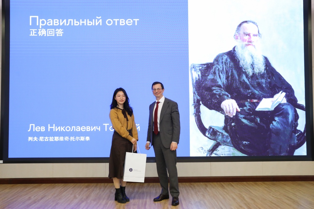 随后,人文学院院长菲力克斯·阿日莫夫围绕俄罗斯文学常识与在场学生展开互动问答。其设计的题目既涵盖俄国诗歌创作传统与文学发展脉络,又巧妙结合中俄文化交流现状与文明互鉴的时代命题,引发学生积极应答。答题环节后,阿尼西莫夫校长亲自为参与者颁发纪念品,现场氛围愈发热烈融洽。