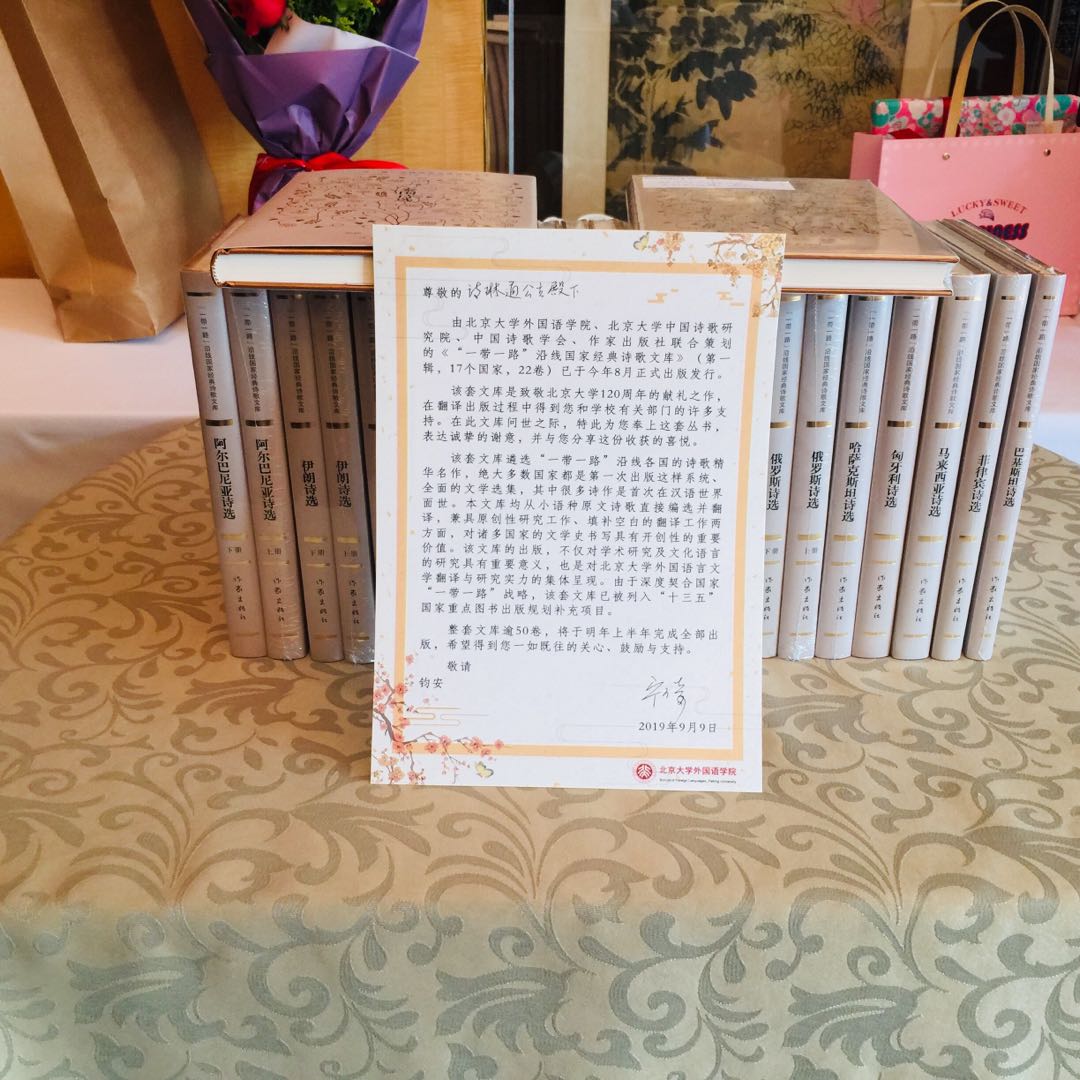 2019年9月29日下午,泰王国诗琳通公主在参加完中华人民共和国国家勋章和国家荣誉称号颁授仪式之后,前往北京丽思卡尔顿酒店宴请前任中国驻泰大使和公主的汉语教师代表。我国泰语界著名专家、翻译家、诗琳通讲席教授裴晓睿受邀参加了此次宴请活动,并作为译者之一向公主赠送了由北大3003新葡平台登录入口、北大中国诗歌研究院和作家出版社联合策划出版的《“一带一路”沿线国家经典诗歌文库》(第一辑)一套。
