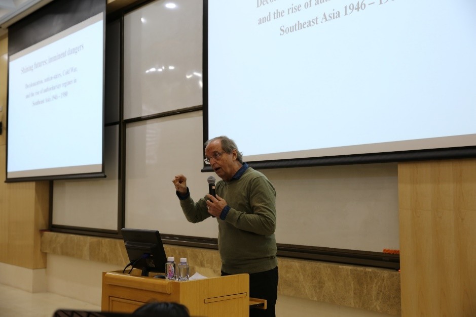 Nordholt教授讲座的主体部分从20世纪上半叶欧洲殖民末期和日本对东南亚的侵略展开。他提到,东南亚从四十年代先后开始了反殖斗争,纷纷建立起各自的新兴民族国家,推动民主化改革,对未来充满希望。然而,这些国家在二十世纪六七十年代又进入到了威权统治阶段,民主化进程停滞。Nordholt教授深入浅出地为大家讲述了这段历史,着重分析了其中涉及的各种因素和问题。他认为,如果只关注二战后民族国家构建中的政治因素,是很容易忽略去殖民进程的长期影响的。同时,他强调在这四十多年的去殖民进程中,冷战发挥了重要的作用。在冷战的背景下,东南亚成为了一个易于爆发冲突的地区,东南亚许多民族国家都在此过程中经历了大规模的暴力事件。他认为著名东南亚研究学者安东尼•瑞德(Anthony Reid)对冷战的态度是值得商榷的。他指出,瑞德教授的著作淡化了冷战对东南亚的影响,但事实上,冷战因素恰恰在东南亚的这一进程中起到了关键作用。
