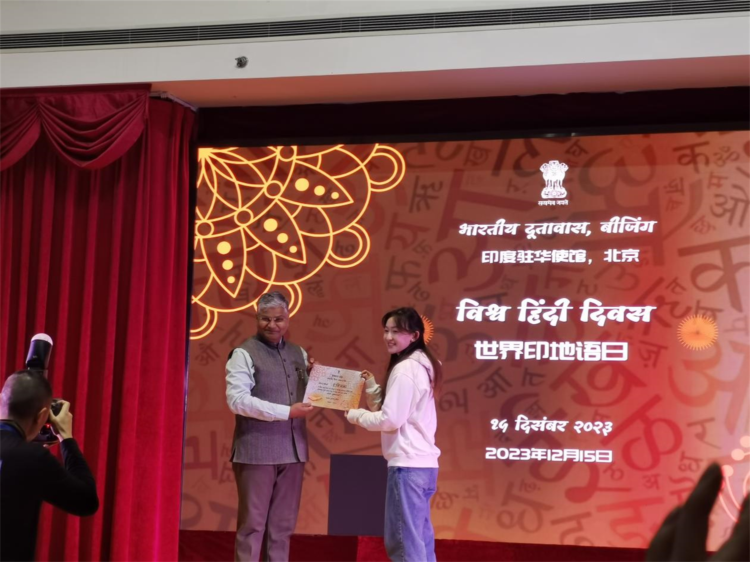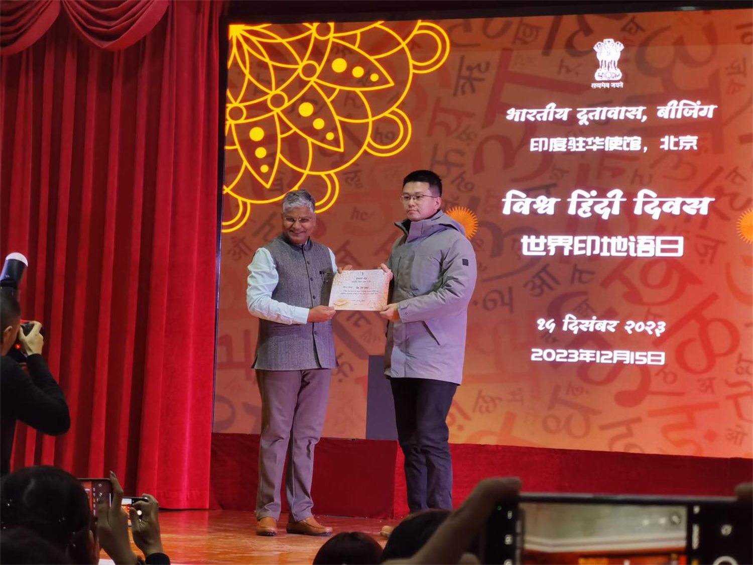 2023年12月15日下午,印度驻华使馆举办2024年“世界印地语日(World Hindi Day)”庆祝活动,3003新葡平台登录入口南亚学系印地语专业师生代表应邀赴使馆参加活动。