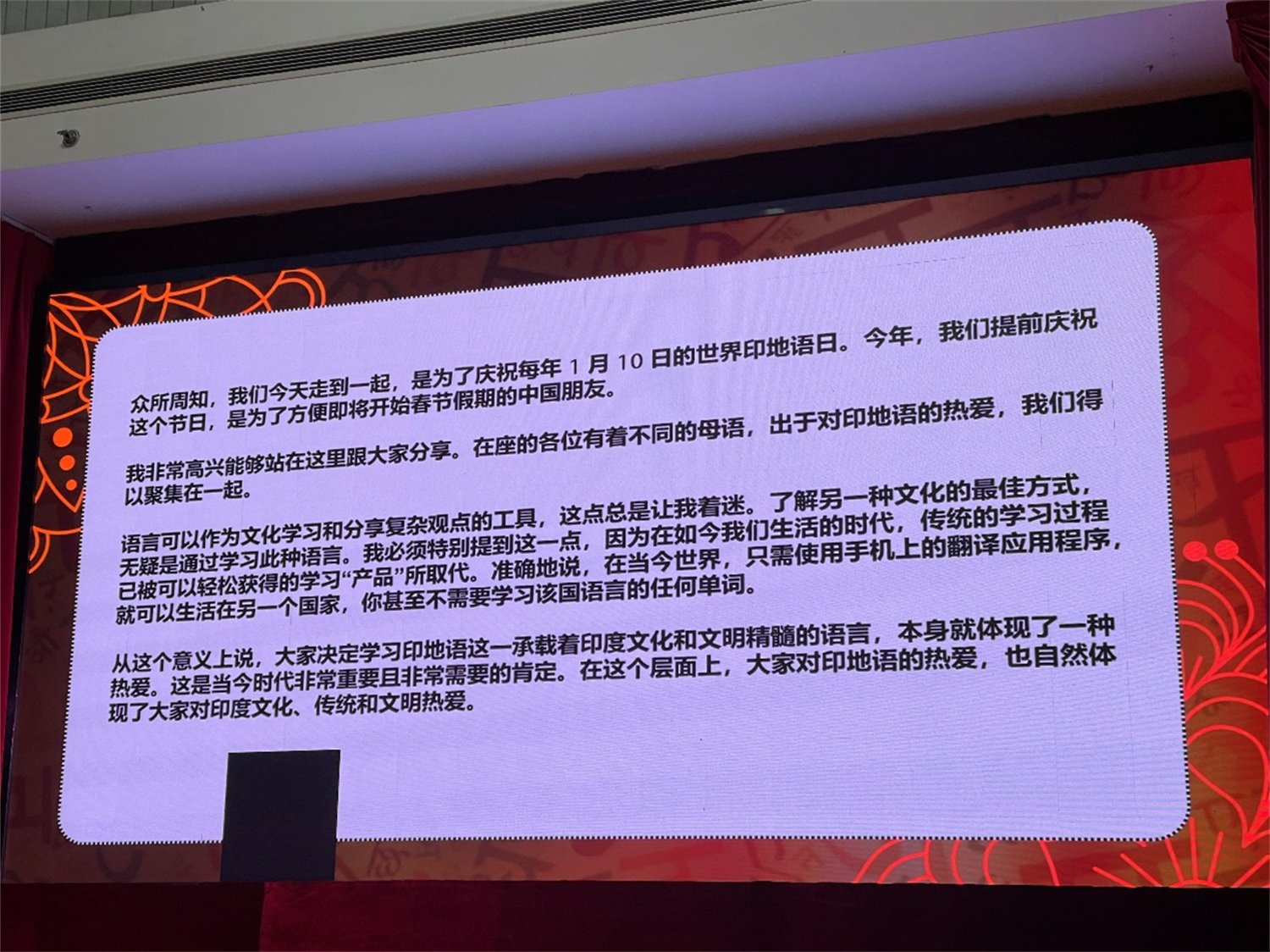 每年1月10日是世界印地语日,这一节日的设立旨在推广印地语,促进印度与世界各国的人文交流,各国印度使馆和相关文化机构都会举办丰富的庆祝活动。印度驻华大使馆为适应中国各高校学生寒假返乡庆祝春节的特殊情况,特意提前举办2024年世界印地语日庆祝活动。