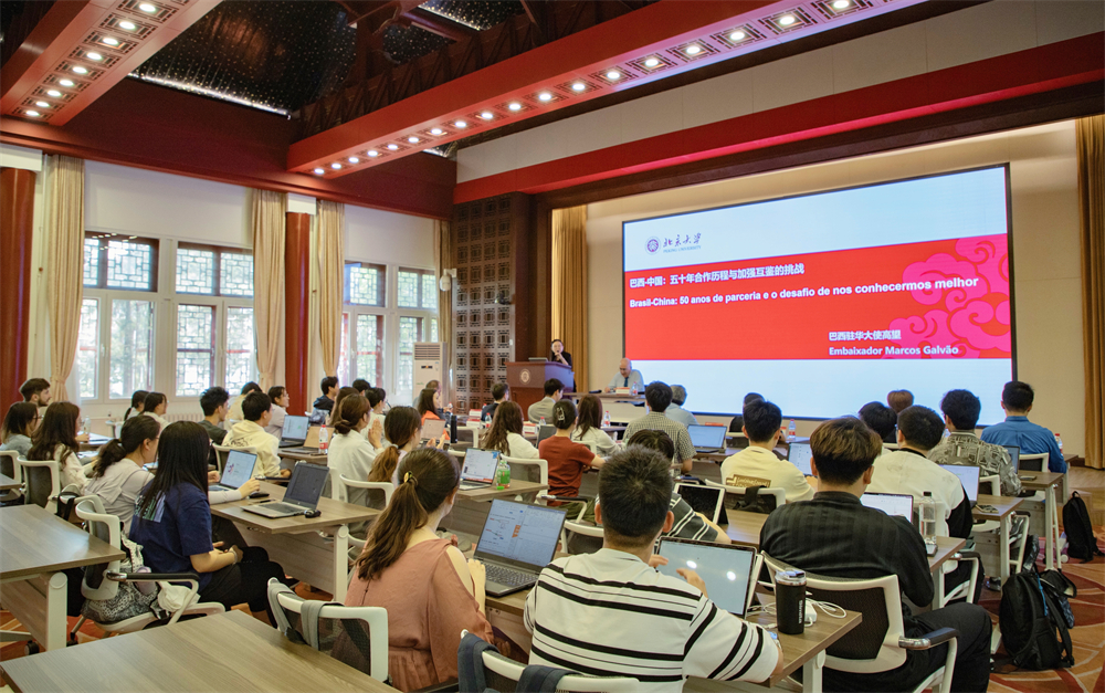 高望大使感谢北大外院葡语专业的邀请以及该专业长久以来对于巴西文学文化的译介与推广。他在演讲中强调,中国和巴西都是拥有丰富资源和广阔市场的国家,经济互补性强。自两国建交以来,双边关系持续深化。2023年,中巴贸易总额达到中法贸易总额的2倍以上,巴西已成为中国最大的农产品进口国,同时也是中国主要的对外投资目的地。两国合作以互信为基础,但在双边关系不断推进的同时,两国对于彼此文化的了解仍亟待加强。为促进双方文明互鉴,需进一步扩大人员交流与在环境保护、新能源等科技领域的合作。高望大使指出,中巴合作不仅对两国发展至关重要,也将对整个世界产生积极影响。