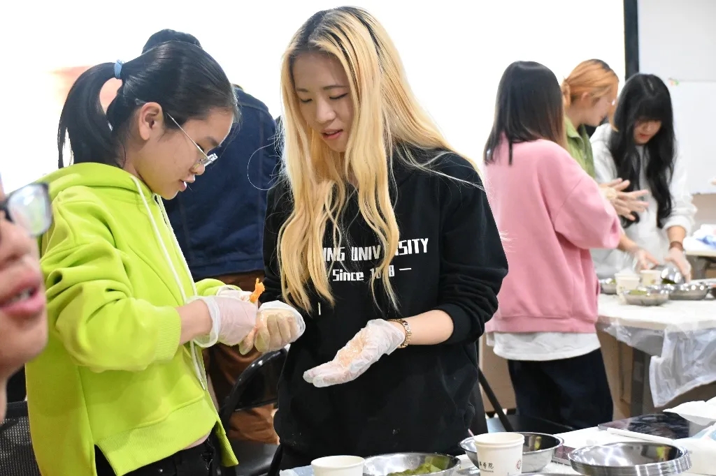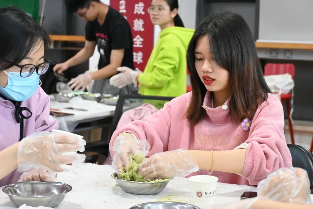 接下来便是做青团了。“青团皎洁似玉环,香韵袭人欲仙去。”青团是传统的清明食品,在这个节日里备受欢迎。青团由糯米粉制成,内夹豆沙、芝麻、肉松等各种馅料,口感绵软,香气扑鼻,是家庭祭祀和外出游玩的必备之物。同学们在揉搓青色的面团中感受着青团特有的芬芳,学院精心准备的各色馅料也极大满足了同学们的口味。经过细致的包裹与装盘之后,一个又一个饱满的成品出现在眼前,现场的欢声笑语不绝于耳。