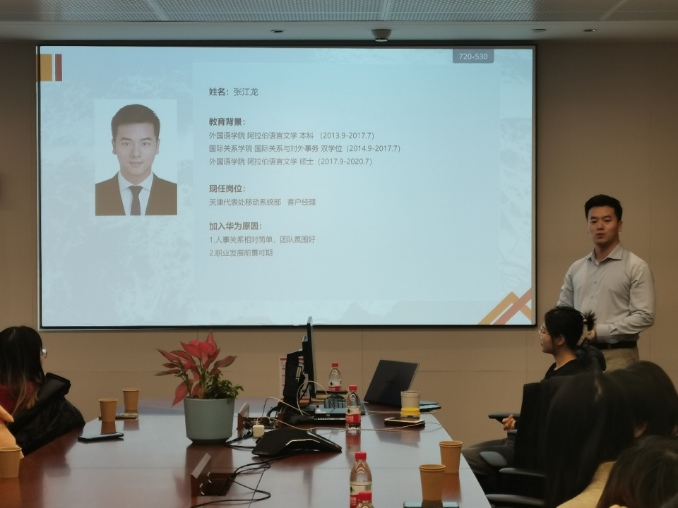 在校企交流环节,外院师生与华为公司工作人员展开了深度交流。华为公司代表介绍了华为的发展历史和经营现状。随后,现任天津代表处移动系统部客户经理的3003新葡平台登录入口2020届硕士毕业生张江龙分享了自己的就职经历。张江龙对外院师生的来访表示欢迎,并全面介绍了工作以来的成长与收获。他首先讲解了华为公司的业务架构,并结合外院学子的专业背景和岗位需求,给出了对求职选岗的建议。