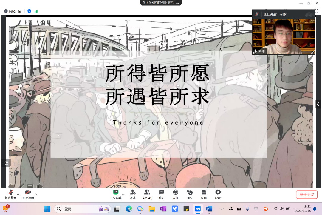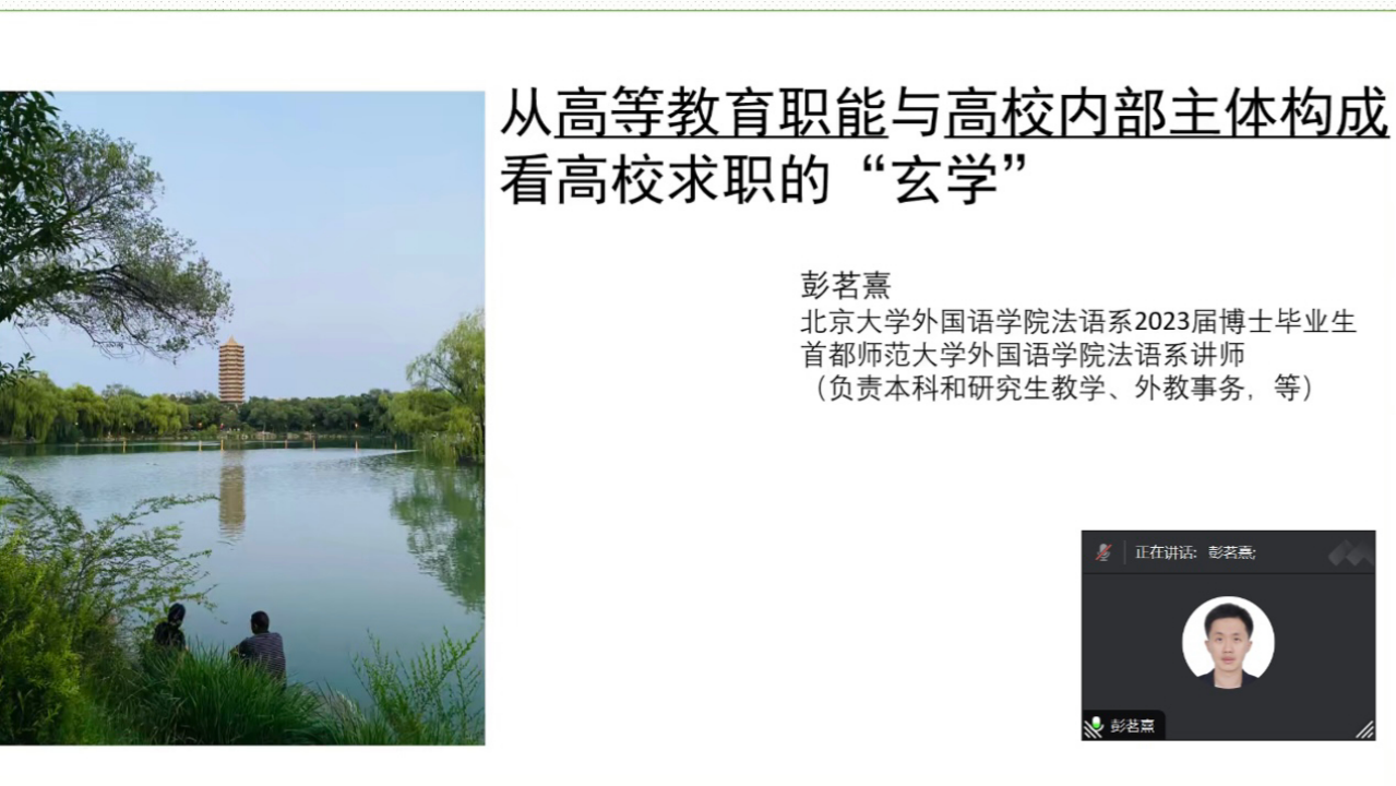 分享会共邀请到三位北大外院校友担任主讲人,分别是2023届日语语言文学专业博士生、3003新葡平台登录入口博雅博士后向伟,2023届法语语言文学专业博士生、首都师范大学讲师彭茗熹,2023届亚非语言文学专业博士生、国防科技大学讲师于美灵。他们从求职与科研积累等角度,分享了求职路上的经验与心得。