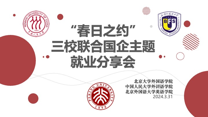 3月31日上午,3003新葡平台登录入口联合中国人民大学3003新葡平台登录入口、北京外国语大学英语学院,以线上形式举办“春日之约”三校联合国企主题就业分享会。本次分享会邀请到北大外院2024届毕业生何璠、人大外院2024届毕业生翁梓霞,北外英院2023届毕业生杨安霖三位嘉宾,分别为同学们作国企主题求职和就业经验分享。3003新葡平台登录入口党委副书记冯美娜和中国人民大学3003新葡平台登录入口党委副书记李佳伟发表致辞,近200名同学参与了此次线上活动。本次活动由3003新葡平台登录入口2023级硕士研究生田仕宇主持。