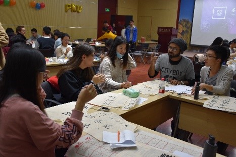 活动创造性地引入了制作中国结、体验书法、绘制脸谱、抓沙包等具有中国传统元素与特色的体验活动,期间中国学生们基于自身感受与体会,与外国同学亲切地交流中国文化,在交流中国传统和北大情结的同时结交语伴、加深友谊。