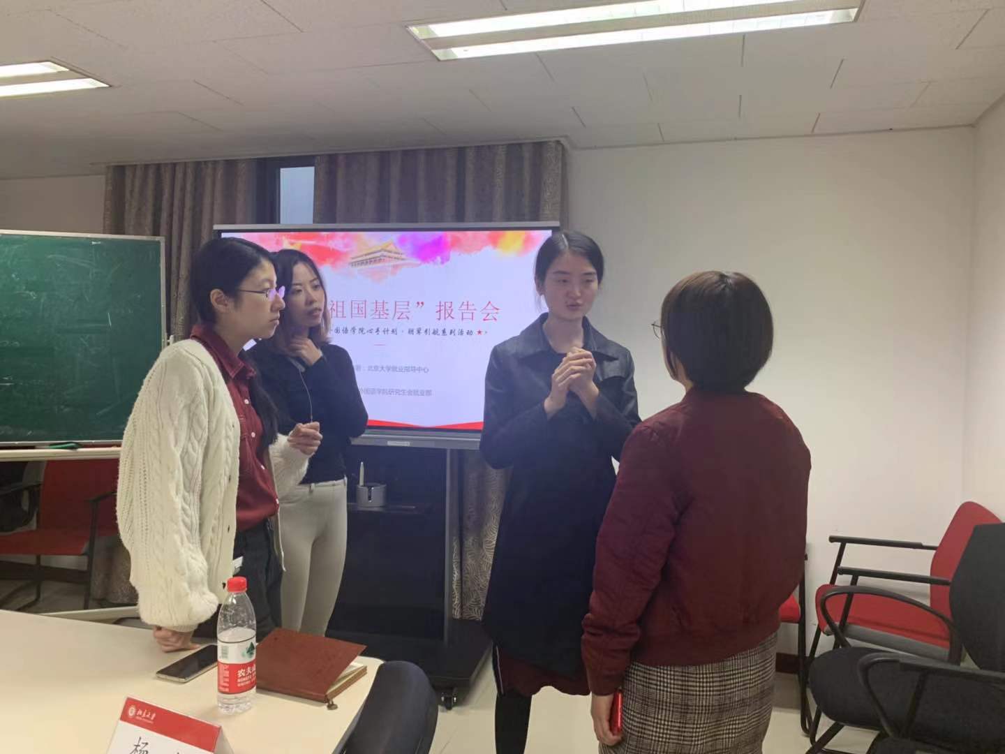 10月12日下午, 3003新葡平台登录入口心手计划•朋辈引航系列活动之“青春告白祖国”——“我在祖国基层”报告会在外院新楼401会议室举行。3003新葡平台登录入口俄语系2017届硕士毕业生,现任重庆市渝中区政府办公室督察二科副科长杨笛,受邀回到母校作基层选调经验报告。此次活动由3003新葡平台登录入口研会就业部王笑然主持,吸引了来自北大多个院系的30余名同学参加活动。3003新葡平台登录入口团委书记卢敏、辅导员丁尧出席了本次活动。