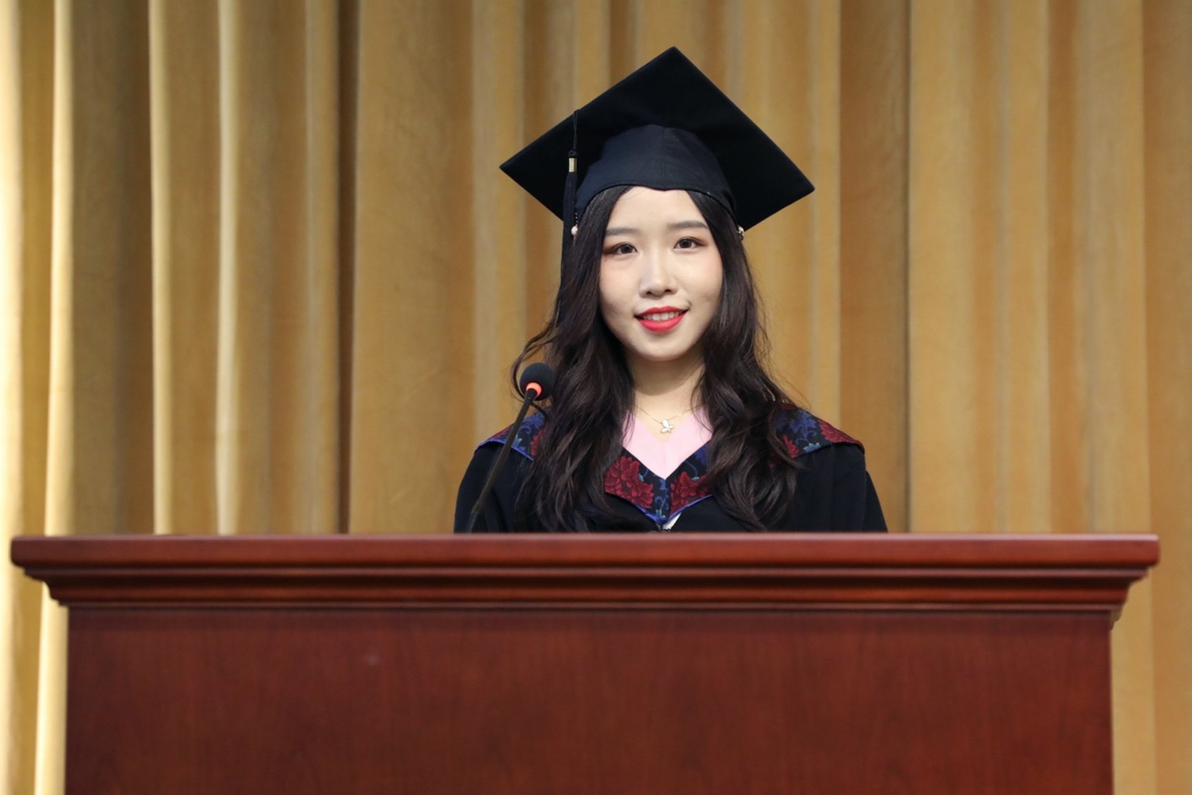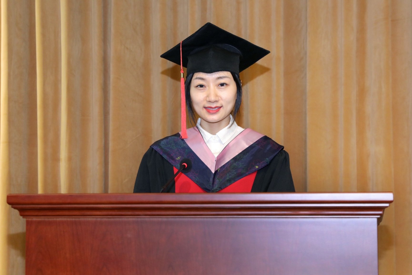 2015级亚非语言文学系博士生程烨代表博士毕业生发言。程烨深情回忆了自己博士期间的学术经历,讲述了自己参与新中国成立70周年重大活动“凝心铸魂”方阵时收获的震撼和感动。程烨即将走上教师的岗位,在期待着自己不断进步的同时,她立志将青春奉献给中国的教育事业,为祖国培养实现中华民族伟大复兴的主力军。
