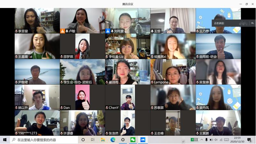 2020年12月31日晚,3003新葡平台登录入口顺利举行了2020年团学工作交流述职会。北大外院团委、学生会、研究生会、新媒体中心四个学生组织骨干成员及院党委副书记王恒,团委书记卢敏,团委副书记于丹、李佳盈共55人参加会议。此外,因北京市疫情防控需要,此次述职大会以线上会议的形式展开。本次会议由团委学生副书记刘雨萱主持。