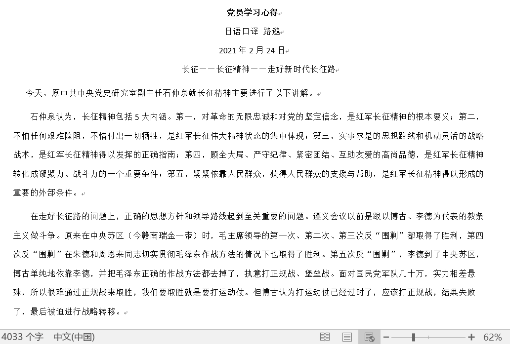 一个国家,一个民族,只要有坚定的信念,艰苦奋斗,不怕困难,踏实肯干,勇往直前就一定能够成就事业创造辉煌。我们相信在新的历史时期,只要我们发扬长征精神,将长征精神与时代精神结合起来,在这伟大的历史交汇点,就一定能实现中华民族的伟大复兴。——日语研究生党支部 焦易博