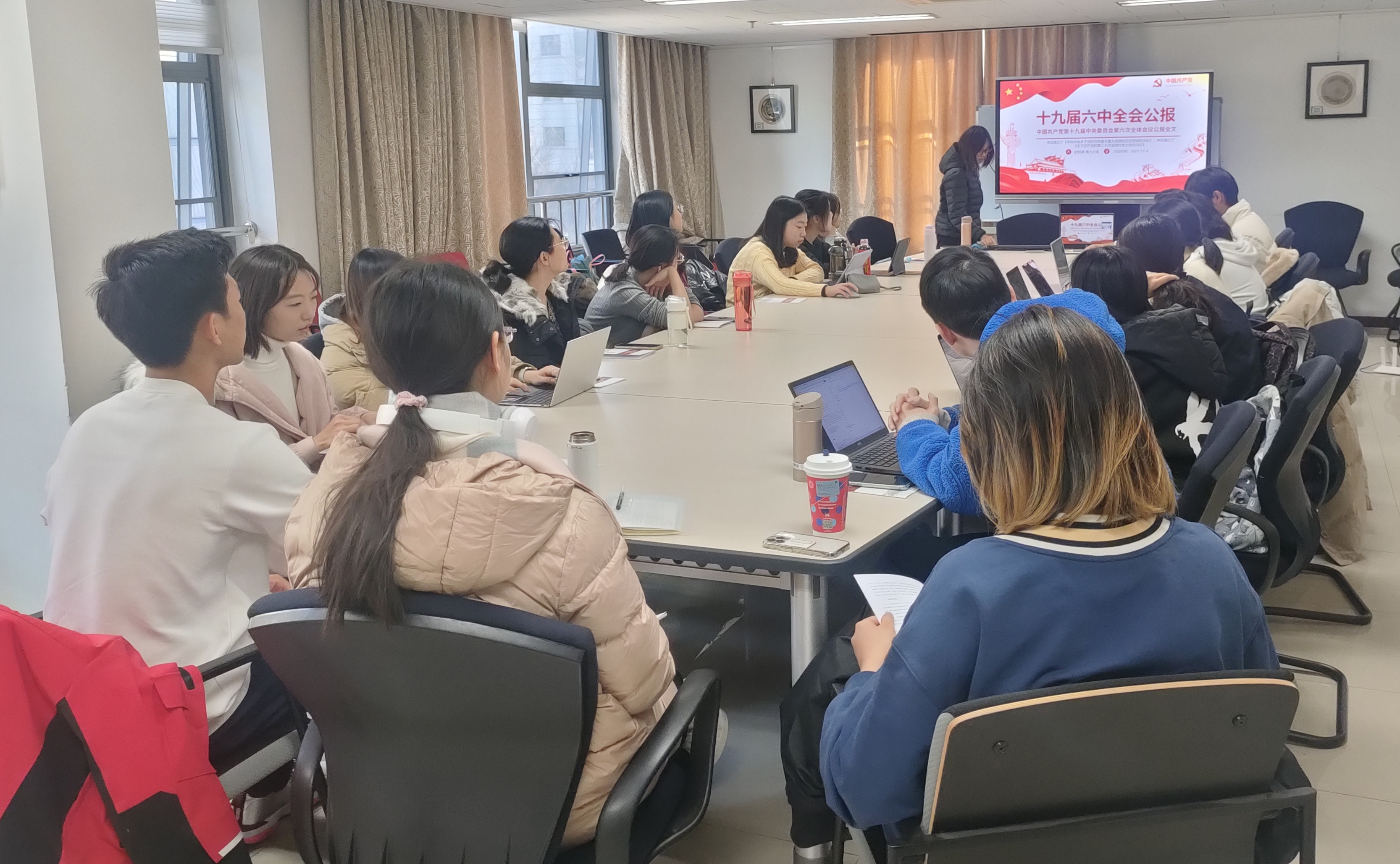 12月5日晚,第四小组以“以我眼观时代,以我心察世界——深入学习十九届六中全会”为题,在外院新楼201会议室召开了第一次集体讨论会。会议由小组长王烁主持。首先,王烁同学向组员们简要介绍了改革开放以来历次中央全会主要议题以及十九大以来历次中央全会研究的主要内容,并带领组员集体回顾了党的十九届六中全会的背景和基本情况,明晰此次会议召开的必然性和重要意义,学习本次会议提出的新论述。接下来,组员们聚焦“外媒对党的十九届六中全会的报道和论调”以及“新时代青年对党的十九届六中全会的精神诠释”两个问题,畅所欲言交流感想。本次讨论内容丰富、气氛活跃、见解深刻,组员们表示对全会有了更加深入的理解,希望在未来的学习生活中能够真正用自身外语专业的知识助力国家建设,无愧今天的使命担当,不负明天的伟大梦想。