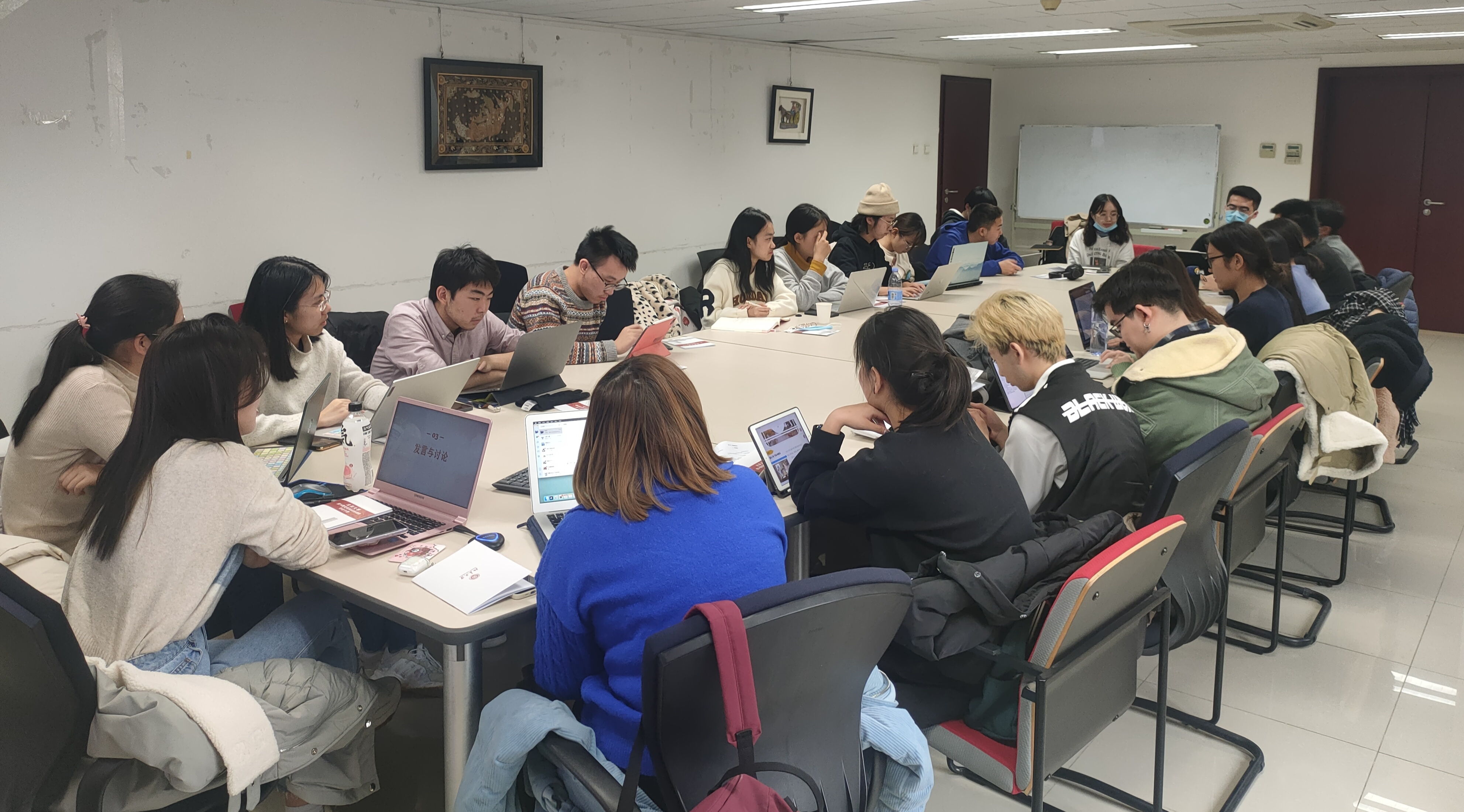 11月28日下午,第七小组在外院新楼201开展了第一次集体讨论会。会议分为自我介绍、主题分享、发言与讨论三项议程,由组长康美玲主持。首先,小组成员们结合个人特征进行了简短的自我介绍,进一步拉近了彼此之间的距离,为之后的学习和讨论环节准备好了火热的气氛。主题分享环节中,主持人康美玲同学带领小组成员认真研读十九届六中全会公报内容,回顾党的百年奋斗成就和历史经验的重要意义,学习贯彻十九届六中全会精神。发言与讨论环节中,同学们结合自己所学专业、出国交换经历等,以“外语人”为出发点,围绕“如何讲好中国故事”这一主要问题,纷纷分享了自己的看法与见解。无论是多次亲历跨文化交流场合的高年级学员,还是刚刚入门小语种学习的低年级学员,都一致认为外语学习者作为沟通中外的中坚力量肩负责任之重大,必须要发挥专业特长,向世界讲好中国故事、传播好中国精神,投身于跨文化交流实践。