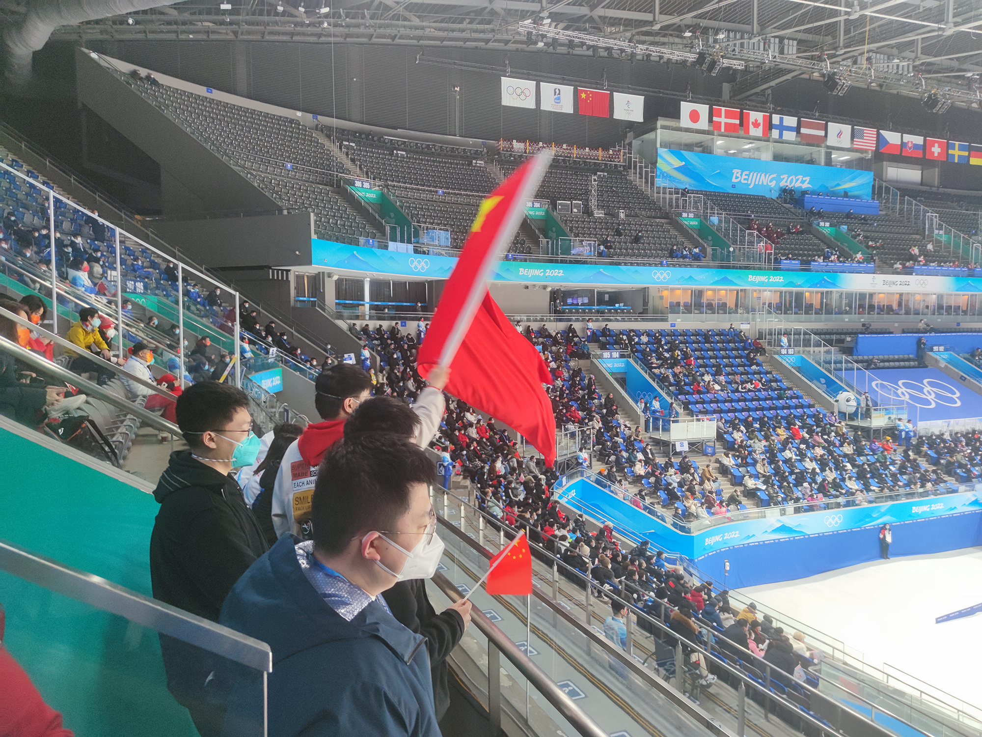 惠晨原同学:我看了十多场男子冰球比赛,我和老师们一样注意到了运动员的精彩表现,同时,现场的观众也让我很感动。小组赛中国对阵德国的时候,中国队打进了历史上第一个进球,当时放起“燃烧吧,骄傲的少年”,全场瞬间沸腾。