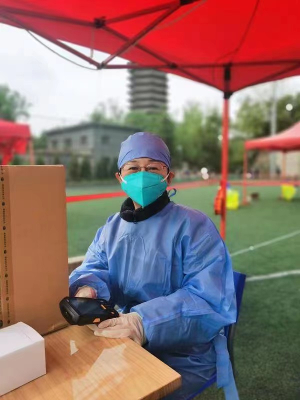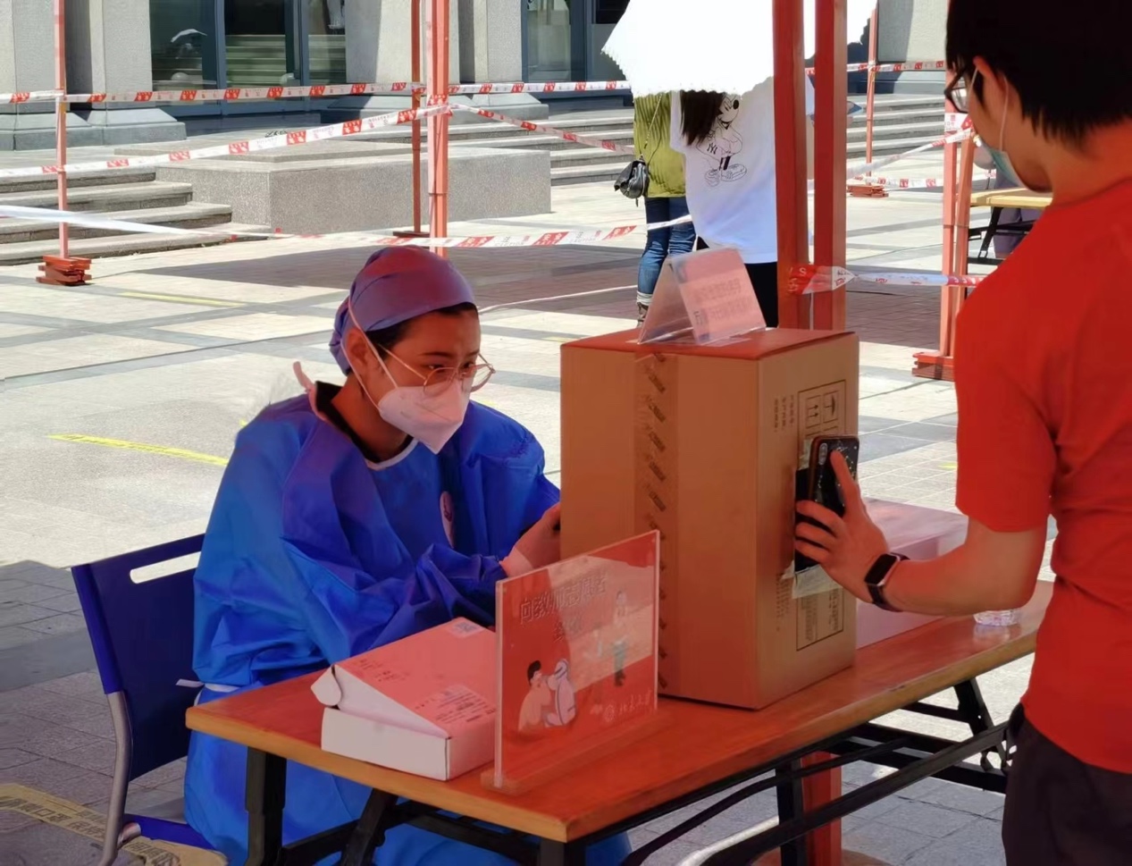 冯一帆老师在本次核酸检测中主要承担了扫码登记工作,在东侧门、一体、百讲西侧、万柳岗位上都参与过志愿服务。