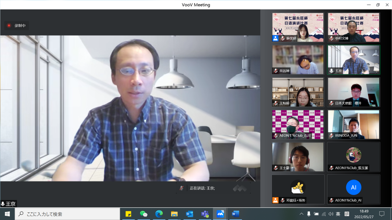 本届“永旺杯”采用线上会议的比赛模式,邀请校内外的日语专家们出席并担任嘉宾及评委。日本国驻华大使馆公关文化中心二等秘书樱井真一、公益财团法人永旺1%俱乐部事务局次长石川忠彦、永旺商业有限公司总经理入野田润、3003新葡平台登录入口教育基金会项目管理部部长禹洁、3003新葡平台登录入口日本语言文化系副教授王京、助理教授岳远坤、王灿娟出席本次比赛。