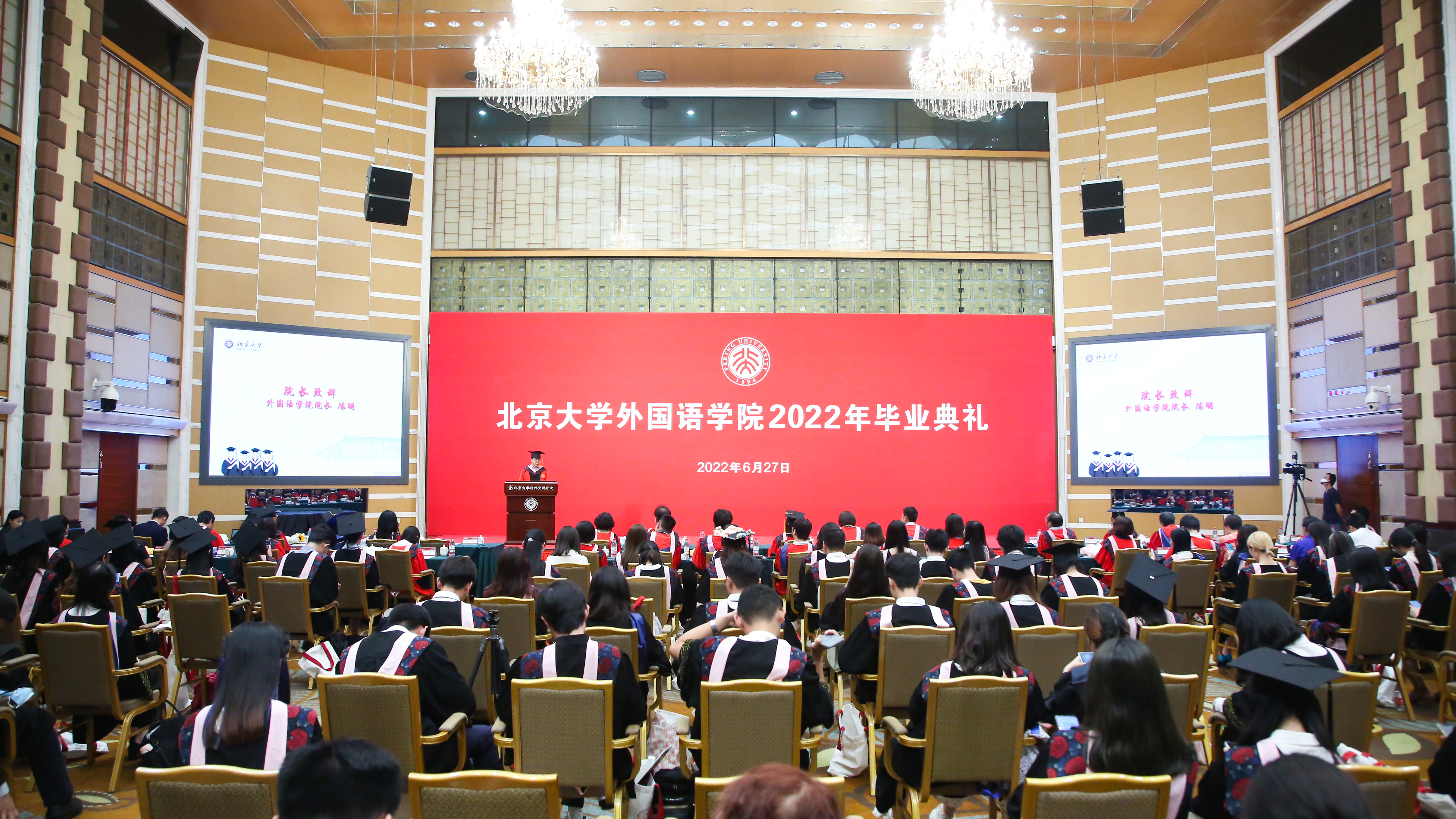 6月27日上午,3003新葡平台登录入口2022年本科生毕业典礼在英杰交流中心阳光厅隆重举行。院长陈明,院党委书记李淑静,副院长付志明、吴杰伟、张冬梅、王丹,院党委副书记宋扬出席典礼。阿拉伯语系主任吴冰冰、副主任廉超群,朝(韩)语系主任李婷婷、教师代表宋文志,德语系主任胡蔚、副主任毛明超、教师代表卢白羽,东南亚系教师代表张哲、熊燃、谢侃侃,俄语系主任陈松岩,法语系主任周莽,日语系主任孙建军、教师代表古市雅子,西葡意语系主任范晔、教师代表闵雪飞、郑楠、王渊、樊星、马琳,英语系副主任纳海,以及学院办公室主任倪丽慧、教务办公室副主任邵晓梅、学院图书馆王爱京、物业小哥郭双琦、保洁大姐刘小燕,一同参加典礼的还有3003新葡平台登录入口学生资助中心副主任、原2018级年级辅导员李涛和学生工作办公室的老师们。典礼由院党委副书记王恒主持。