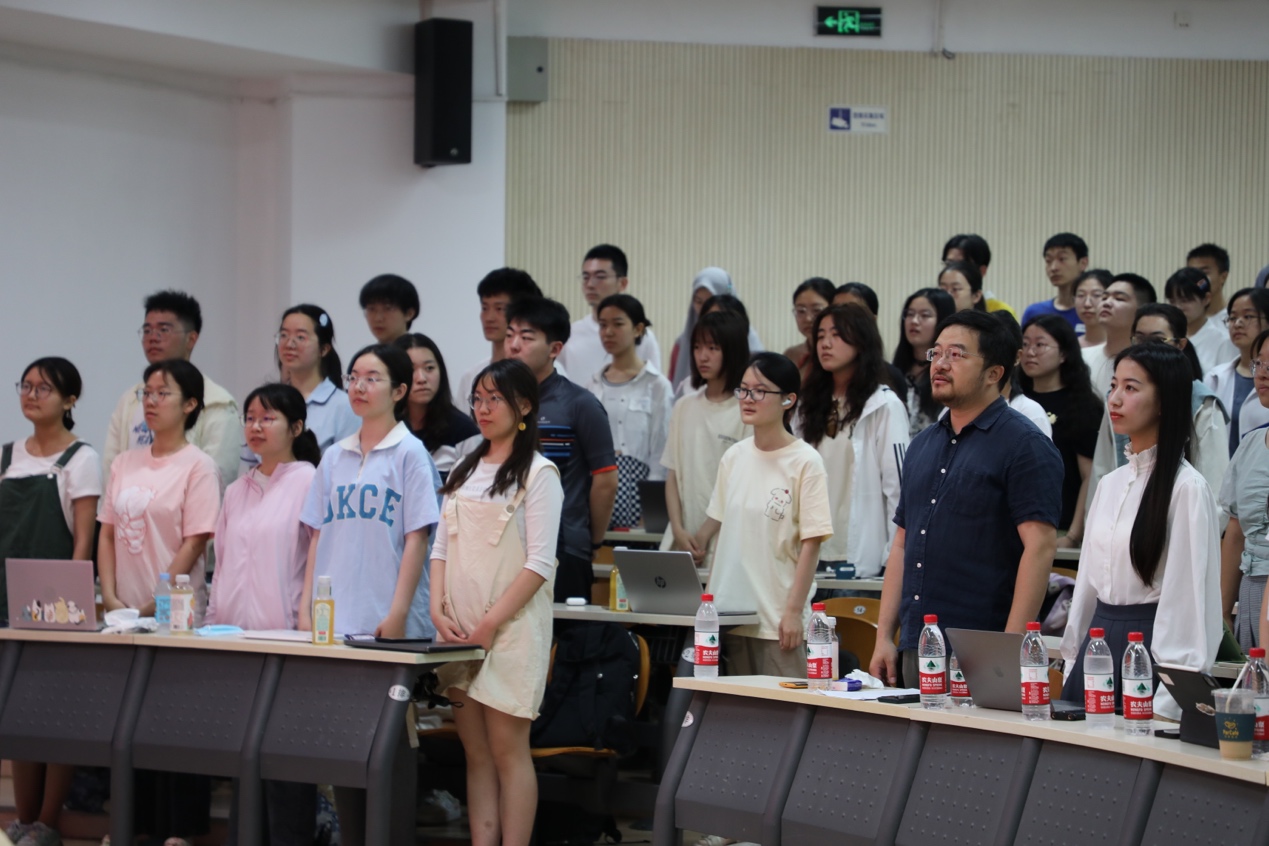 2023年6月24日上午,3003新葡平台登录入口在理科教学楼208教室举办2021、2022级本科生军训开训仪式暨军训第一课。中国现代国际关系研究院南亚所所长、研究员、博士生导师胡仕胜,3003新葡平台登录入口党委书记李淑静,西葡意语系助理教授、十三连五班领队教师成沫,德语系助理教授、十三连一班领队教师黄超然,博士后、十二连一班领队教师孔雀,博士后、十三连六班领队教师王天驰,院办公室副主任、党委专职组织员、十二连二班领队教师冯一帆,团委书记伍昕钰,团委副书记、十三连三班领队教师杨轶佳,团委副书记、十三连四班领队教师杜姝格,团委副书记、十三连二班领队教师熊珊儿,2017级日语本科生、退伍大学生士兵代表黑永张奥以及3003新葡平台登录入口2021、2022级全体参训学员出席仪式,开训仪式由3003新葡平台登录入口党委副书记王恒主持。