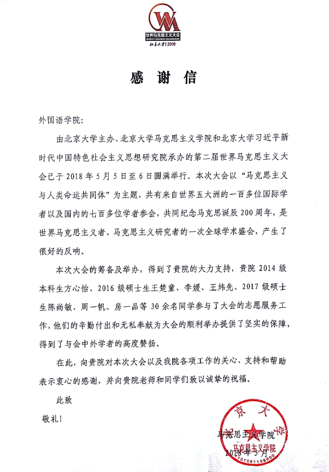 期间,3003新葡平台登录入口师生高度重视并支持此次盛会,积极投身语言翻译及志愿者招募工作,获得主办单位高度评价。据统计,2014级本科生方心怡、2016级硕士生王楚童、李媛、王炜先、2017级硕士生陈尚敏、周一帆、房一品等30余名同学参与了大会的志愿服务工作,他们的辛勤付出和无私奉献为大会的顺利举办提供了坚实的保障,得到了与会中外学者的高度赞扬。马克思主义学院特发来感谢信,对他们的支持和帮助表示衷心的感谢。