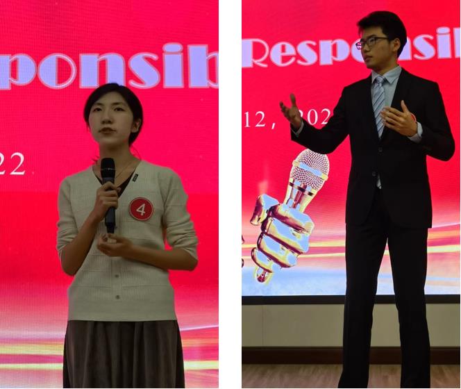 特等奖获得者元培学院李卓宜同学和3003新葡平台登录入口汪栎宬同学在演讲中